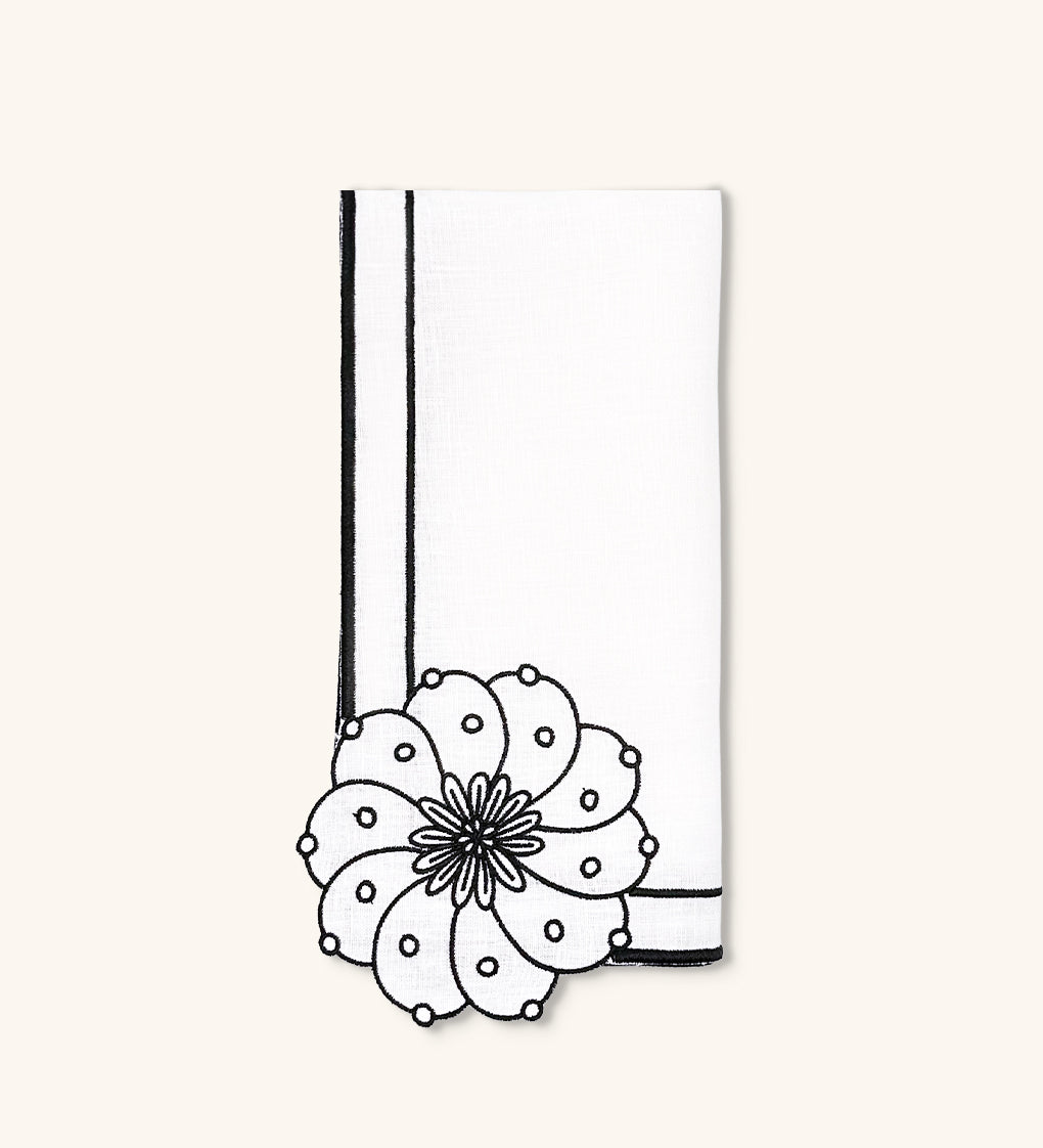 Servilletas Identidad en Lino Blanco con Bordado de Biznaga en Negro. Set de 4
