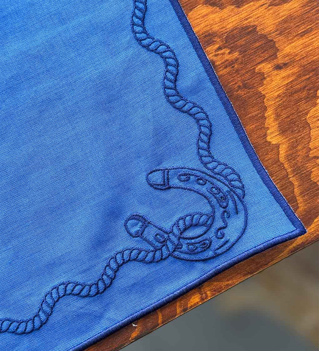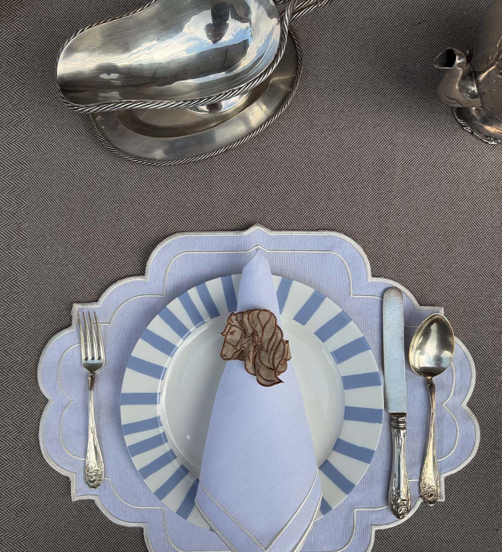 Individual Rectangular en Lino Azul con Bordado de Cuerda y Herradura. Set de 4