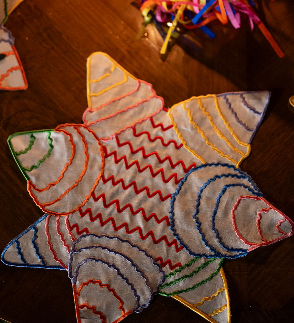 Individuales Posada en Lino Blanco con Bordado de Piñata de Colores. Set de 4