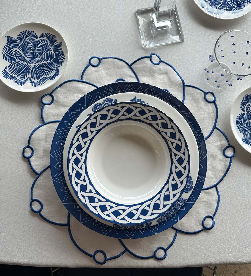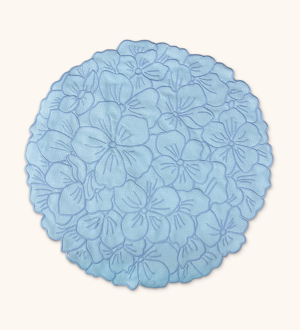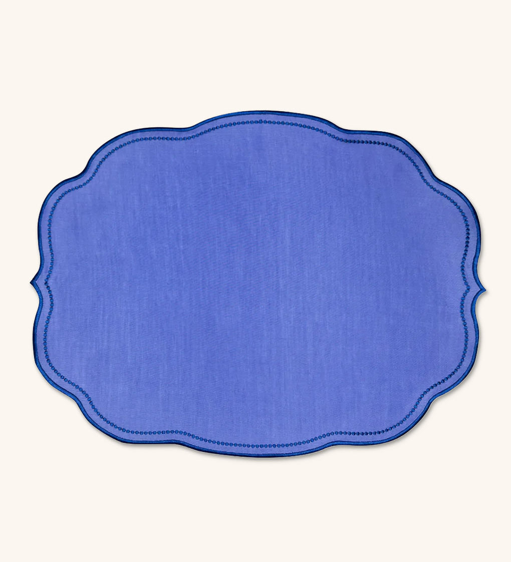 Individuales Vivi en Lino Azul con Bordado de Pelitos. Set de 4