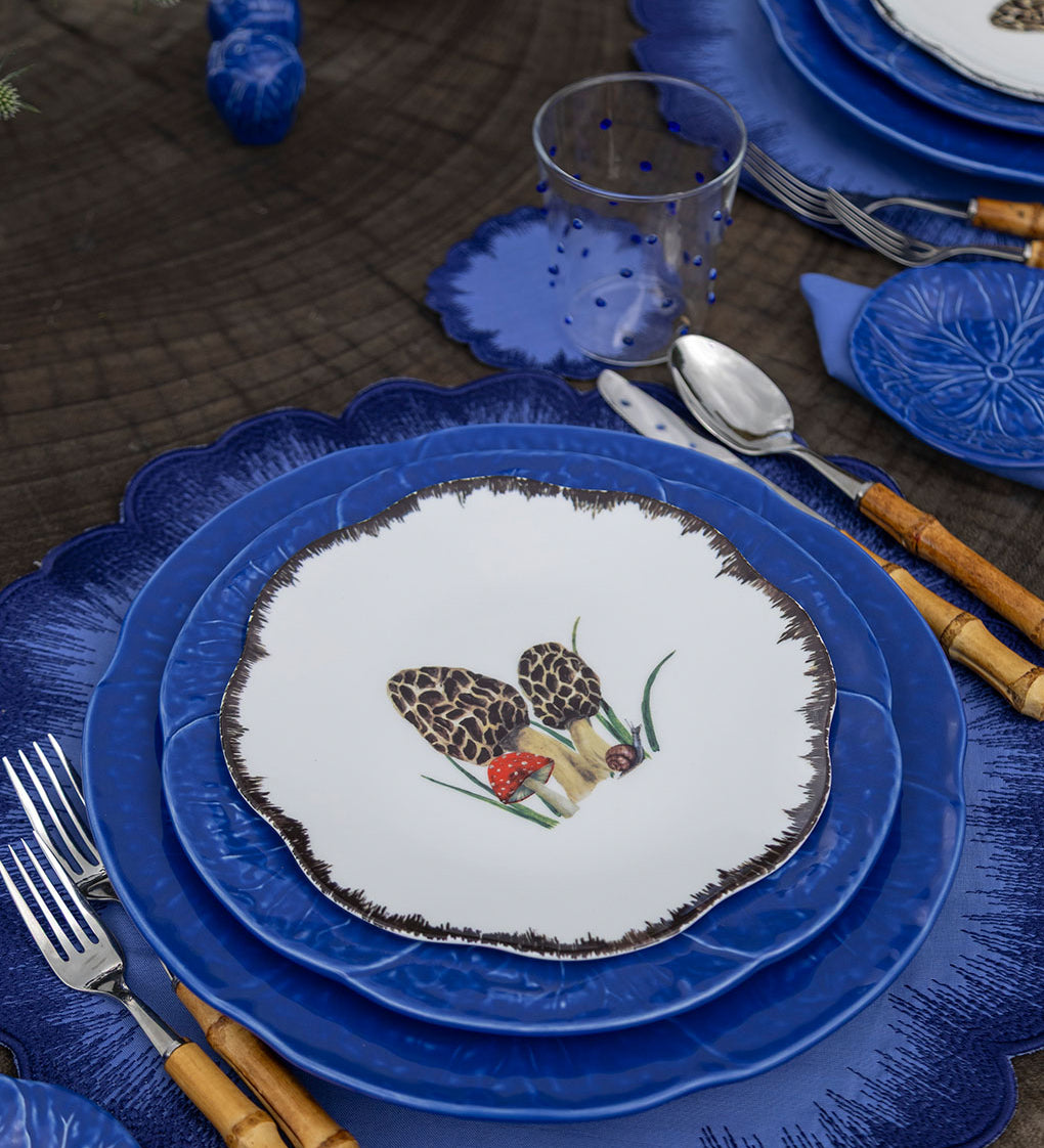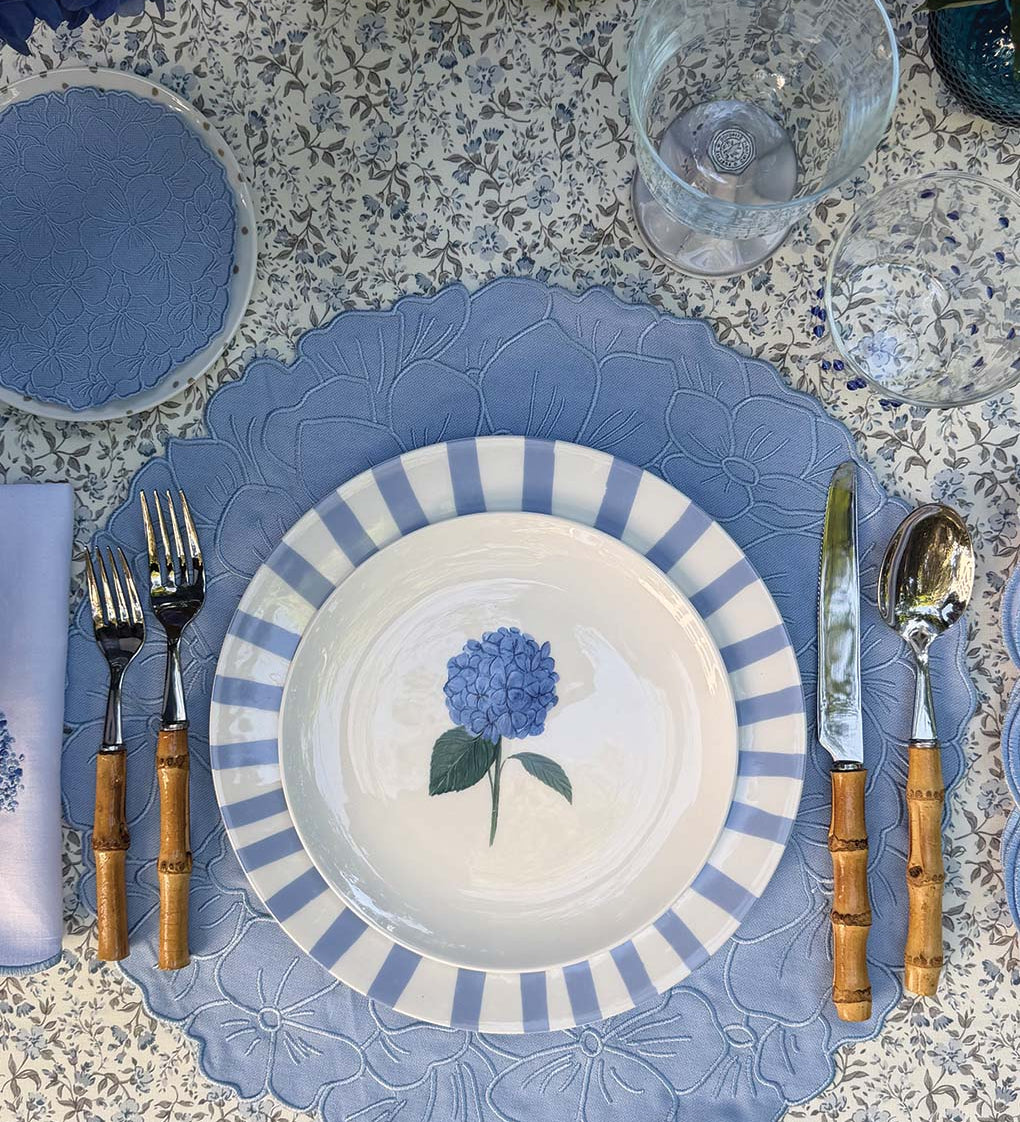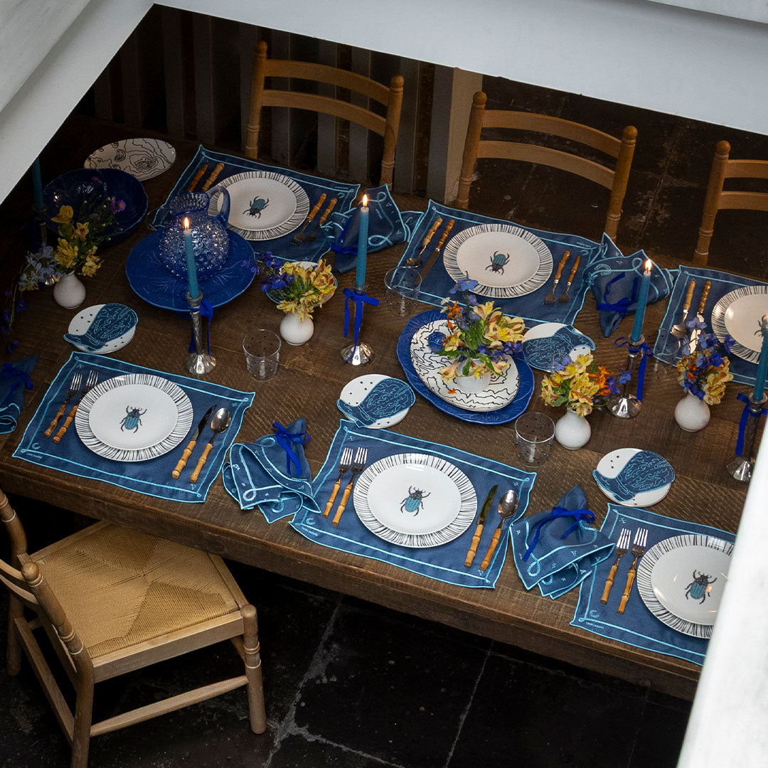 Individuales Vivi en Lino Azul con Bordado de Pelitos. Set de 4