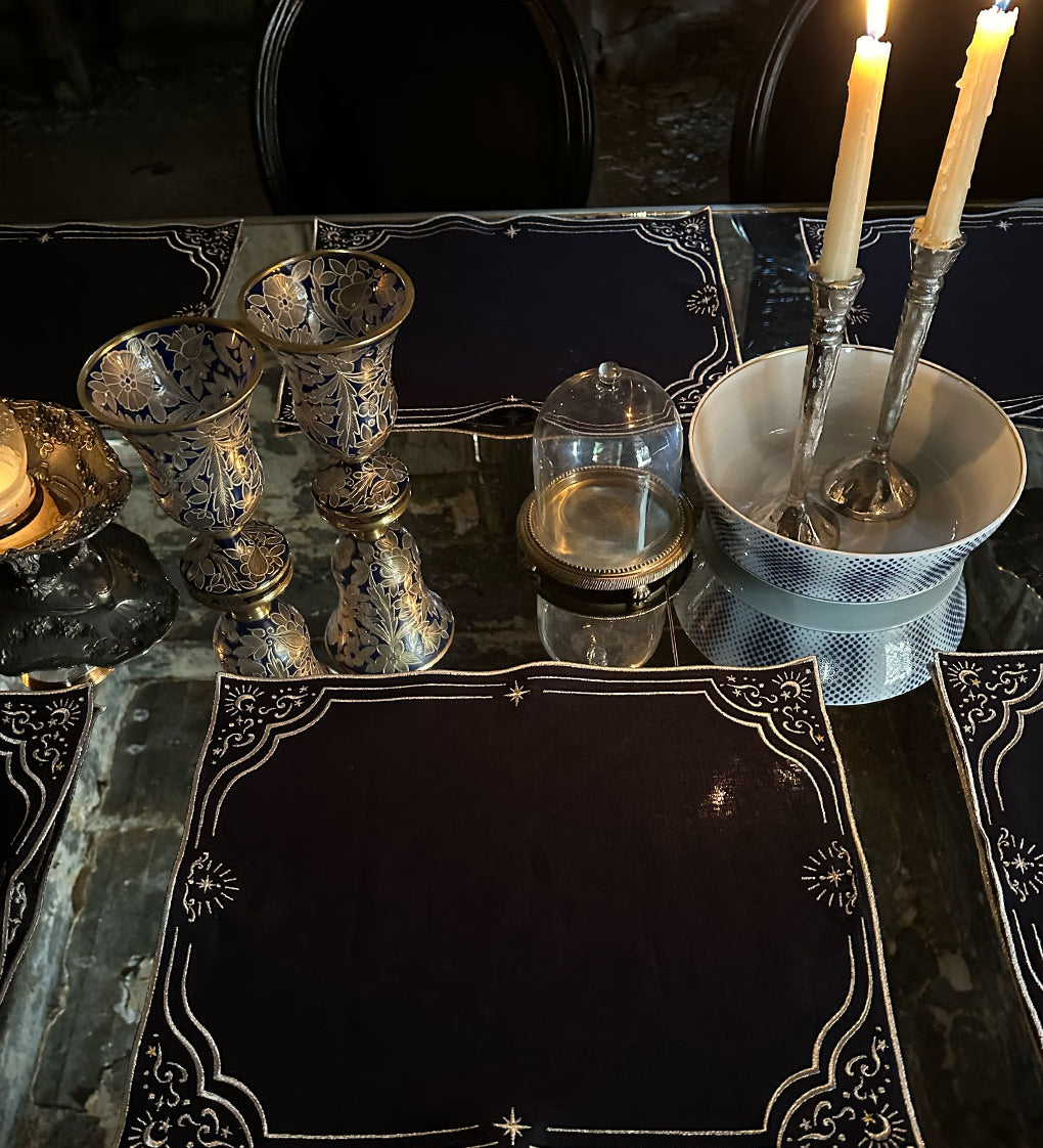 Individuales en Lino Blanco con Bordado de Dragón Negro. Set de 4