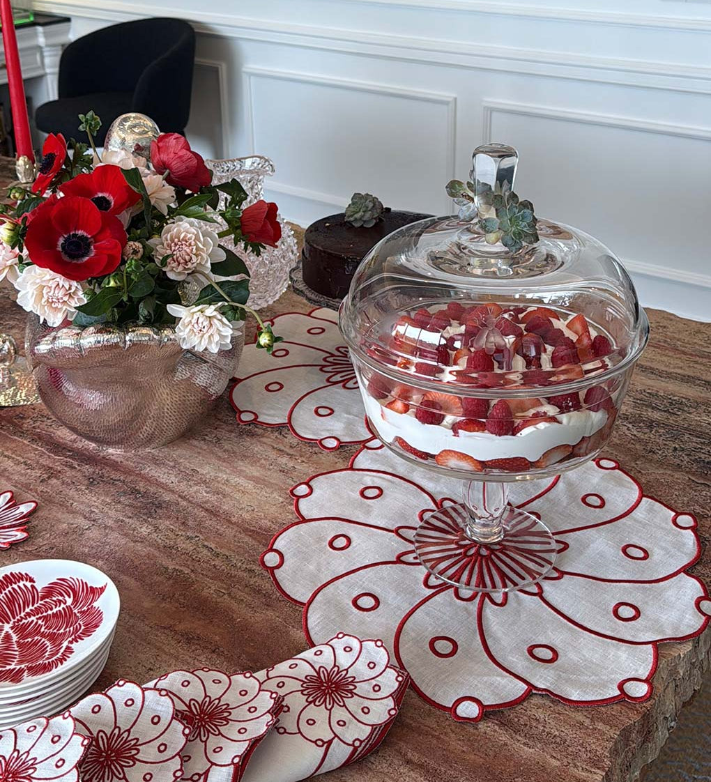 Individuales Silvia en Lino Arena Bordado con Puntitos Rojos. Set de 4