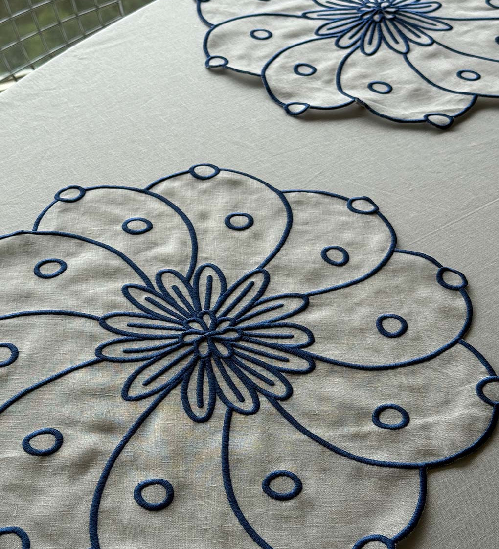 Individuales Identidad en Lino Blanco con Bordado de Biznaga en Azul. Set de 4