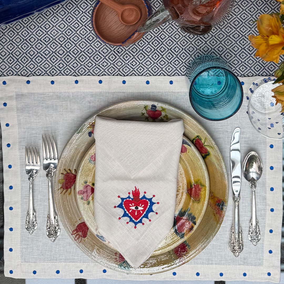 Individuales Silvia en Lino Arena Bordado con Puntitos Azules . Set de 4