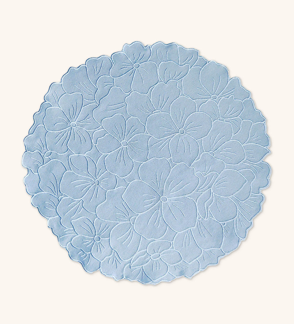 Individuales Bouquet en Algodón Azul con Bordado de Hortensia. Set de 4