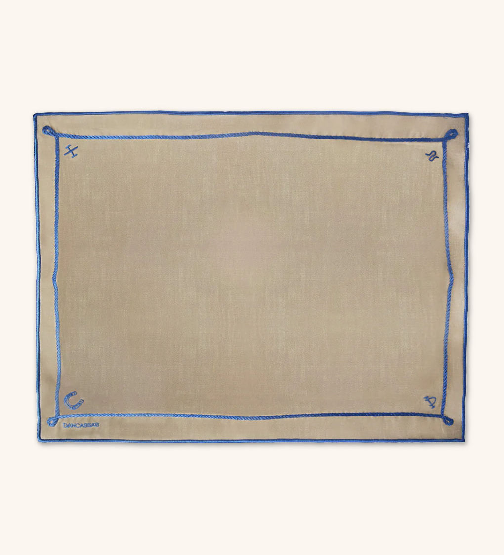 Individual Tropic de Hoja en Lino Arena con Orilla Bordada en Azul. Set de 4