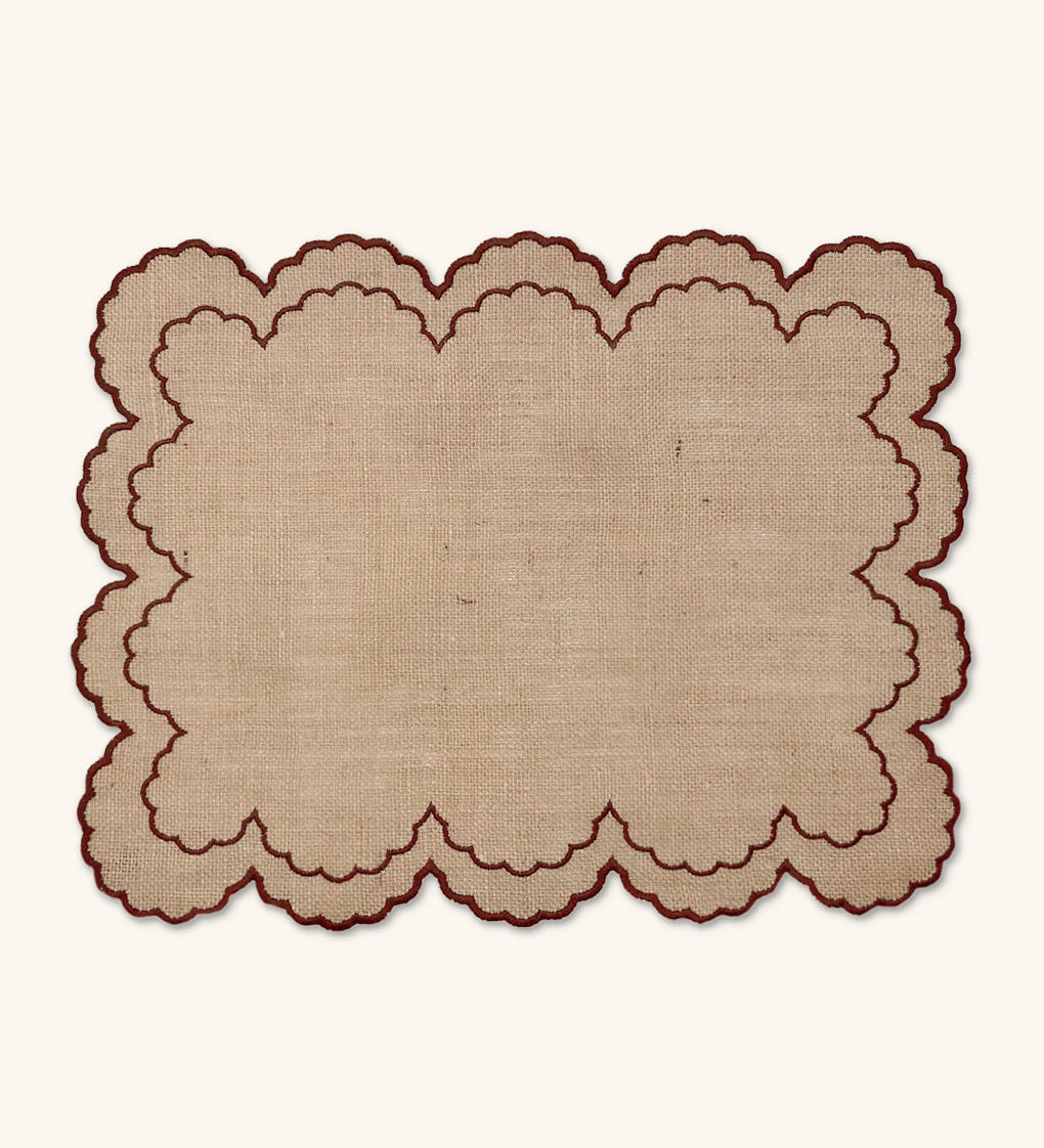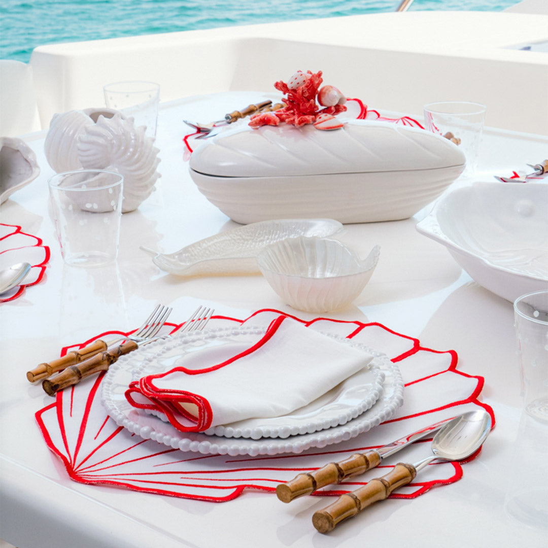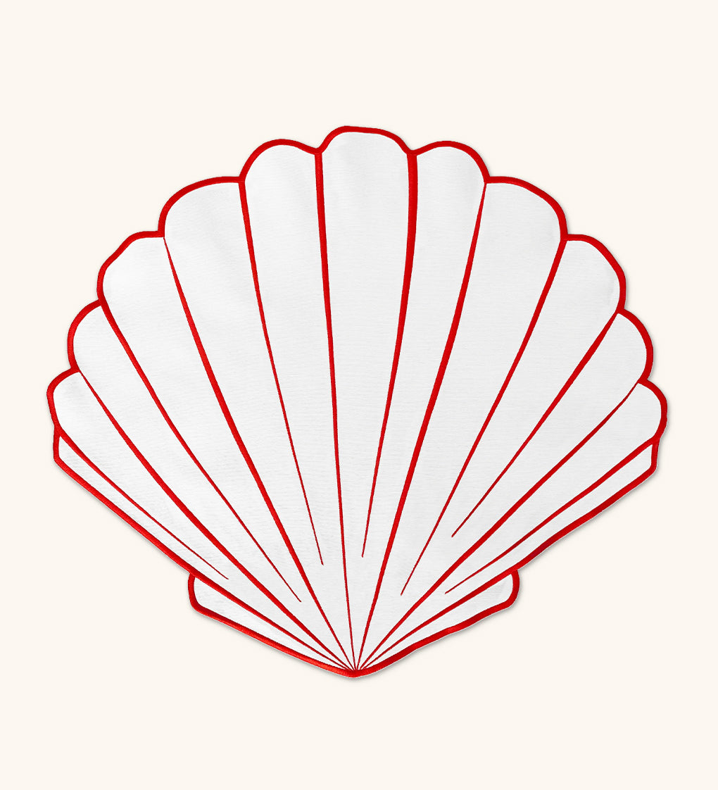 Juego de 4 Individuales en Forma de Concha en Loneta Blanca con Doble Orilla Bordada en Rojo
