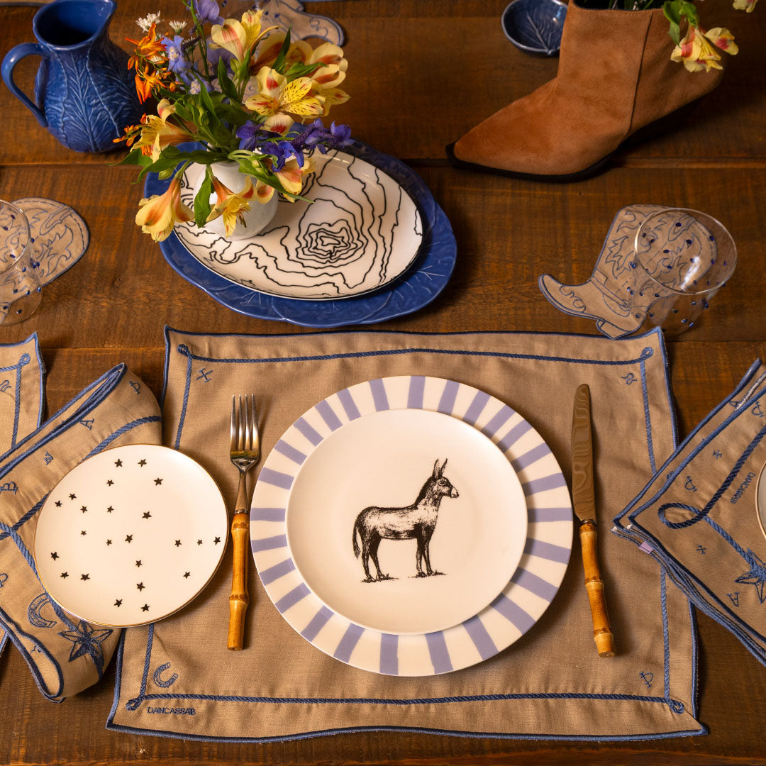 Individuales Cowgirl en Lino Caramelo con Bordado Azul. Set de 4