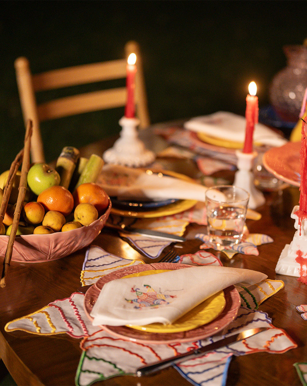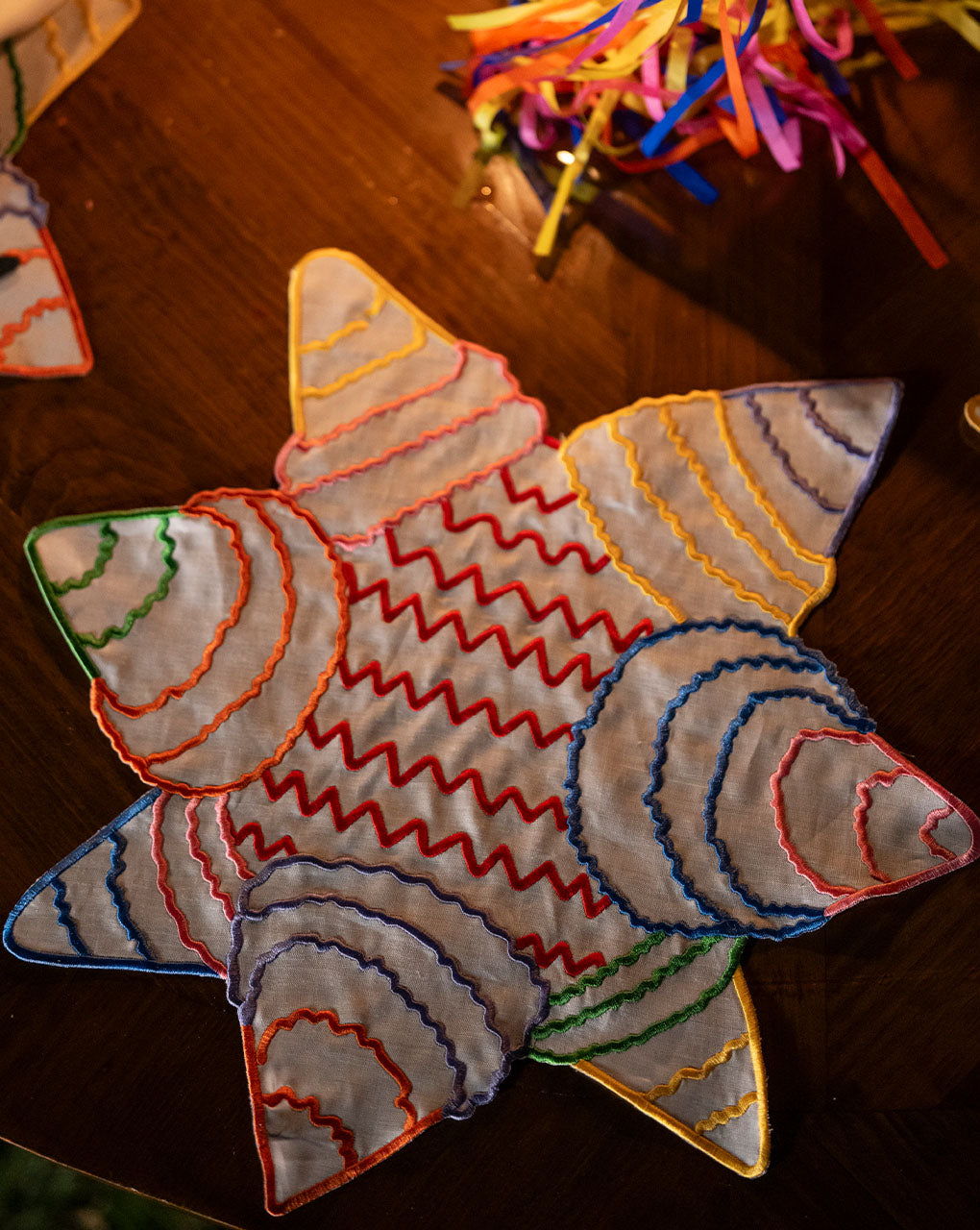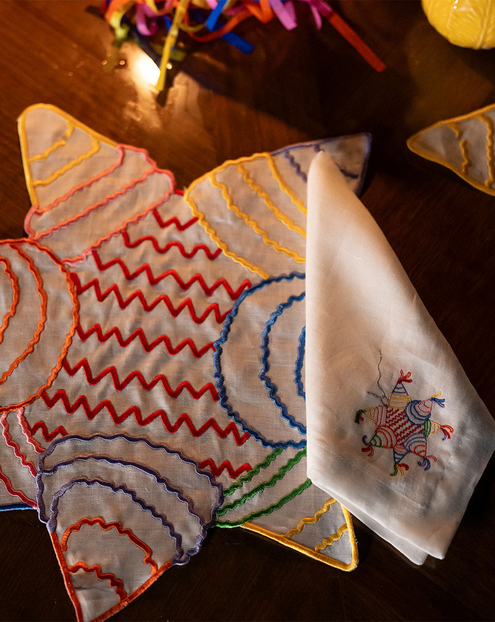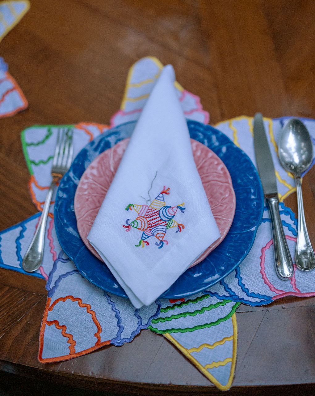 Individuales Posada en Lino Blanco con Bordado de Piñata de Colores. Set de 4