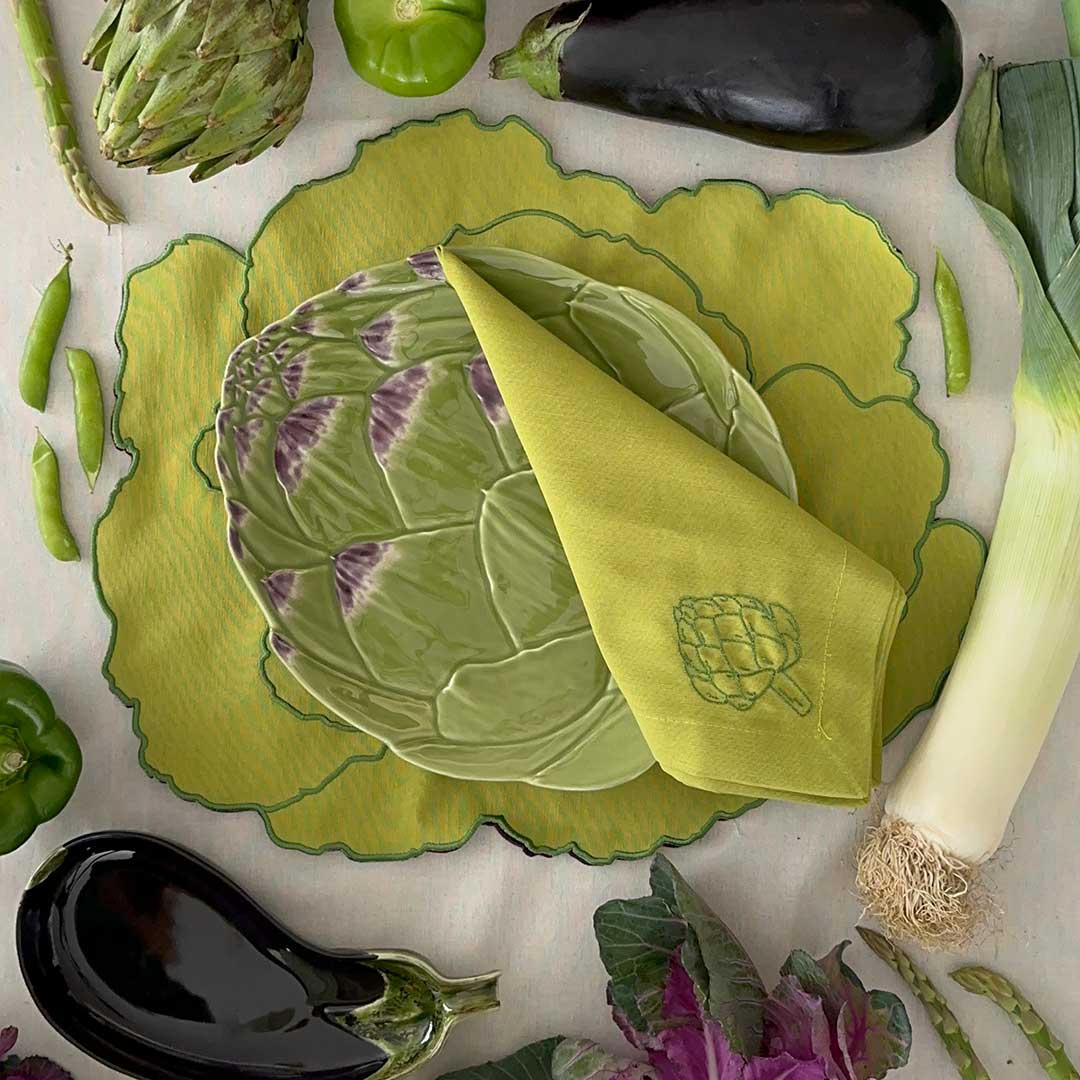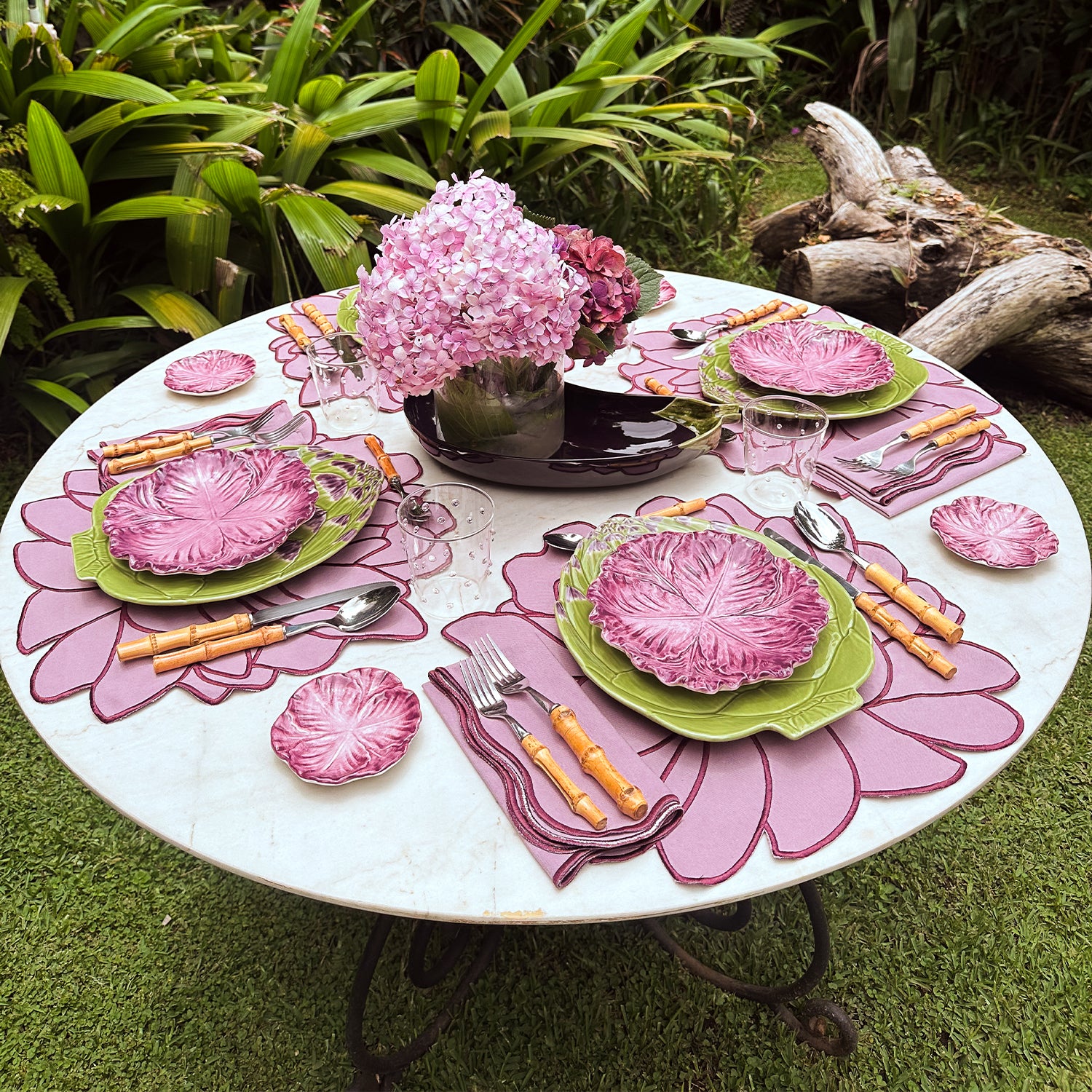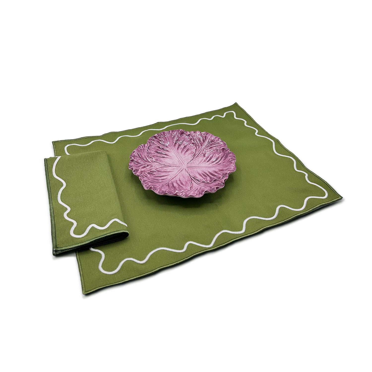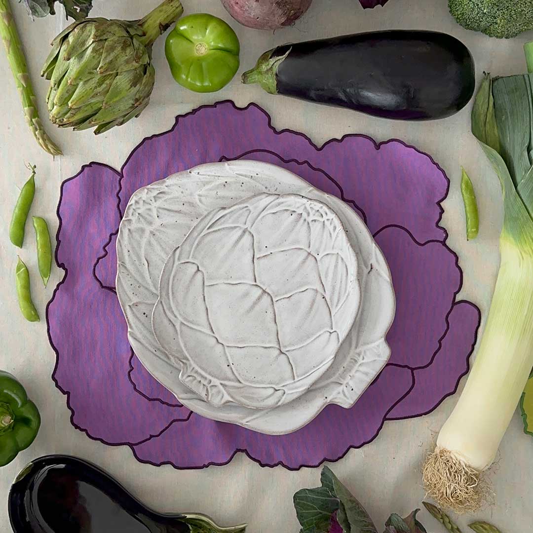 THE RED CABBAGE ZASHPACK: Juego de Mantelería Regina Color Verde Olivo con Ondas en Ivory y Platos Trinche de Repollo Morado. Set para 4 personas.