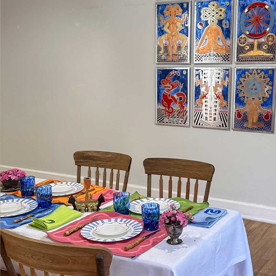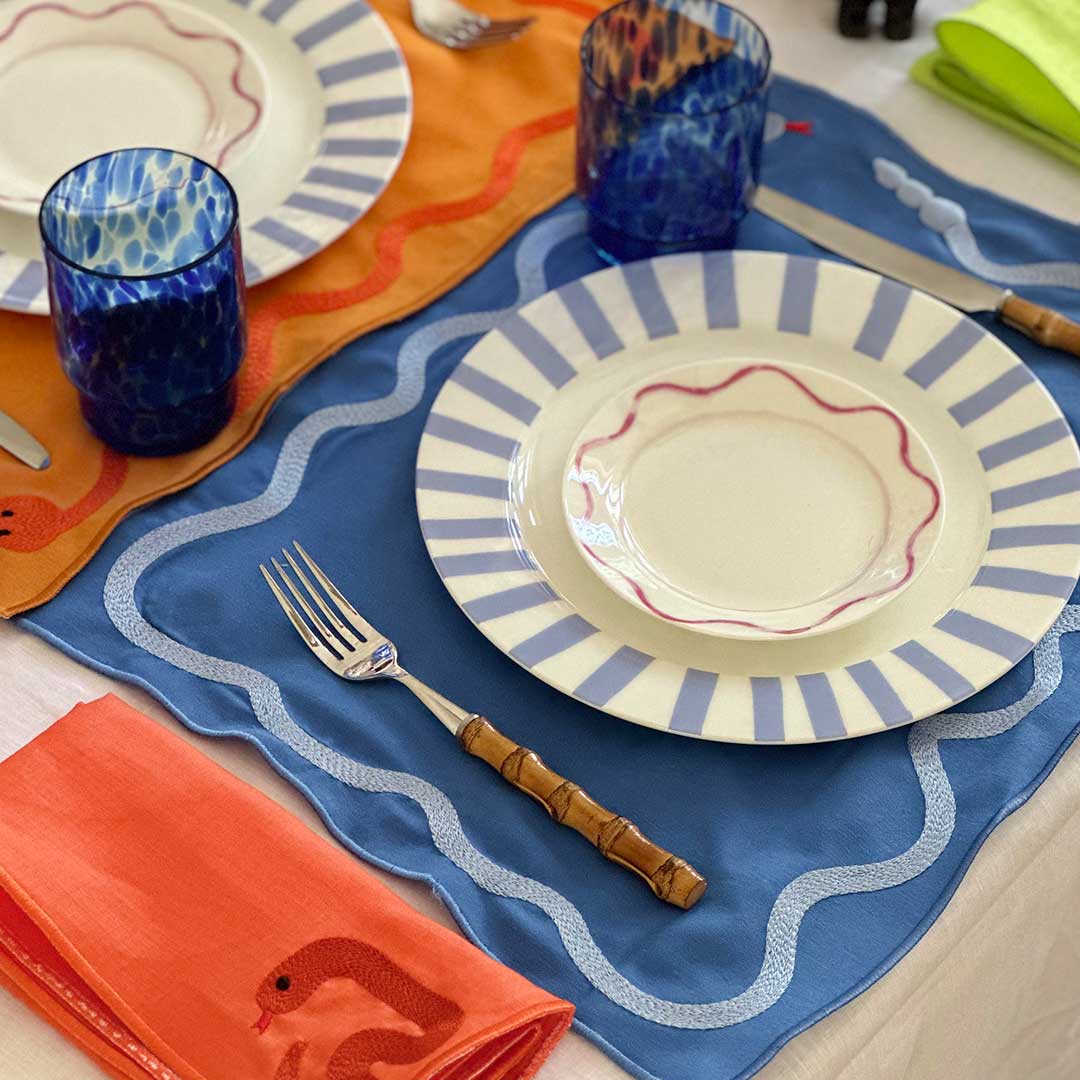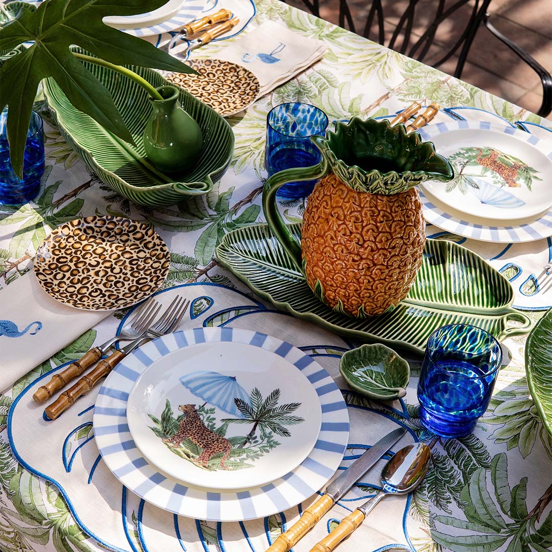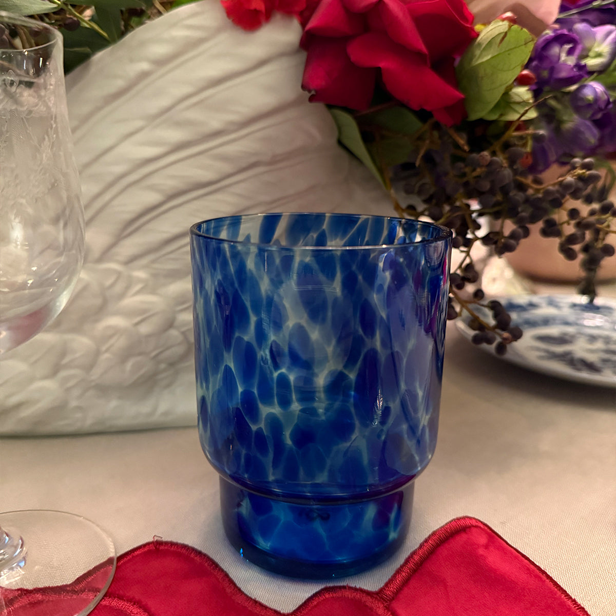 Nuestros vasos favoritos del verano, un cheetah blue tumbler que se ve divino en cualquier setting. Los vasos son de vidrio soplado a mano, por lo que el color y el patrón pueden variar.