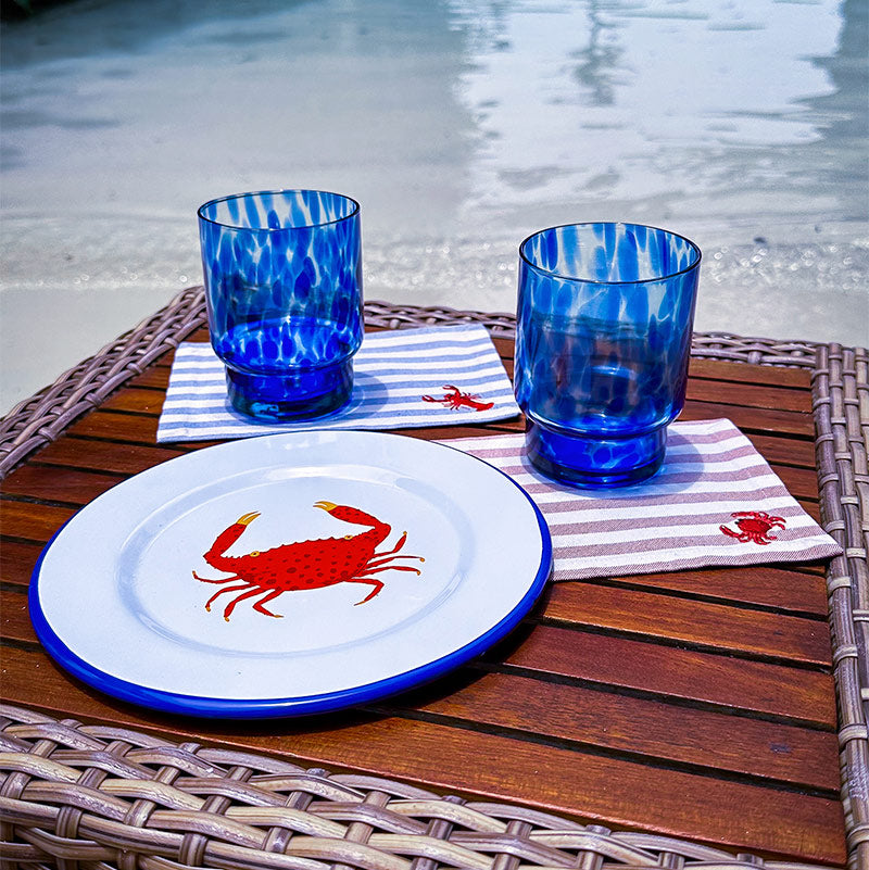 Cocteleras de Loneta con Rayas Blancas y Rojas con Bordado de Cangrejo. Set de 4