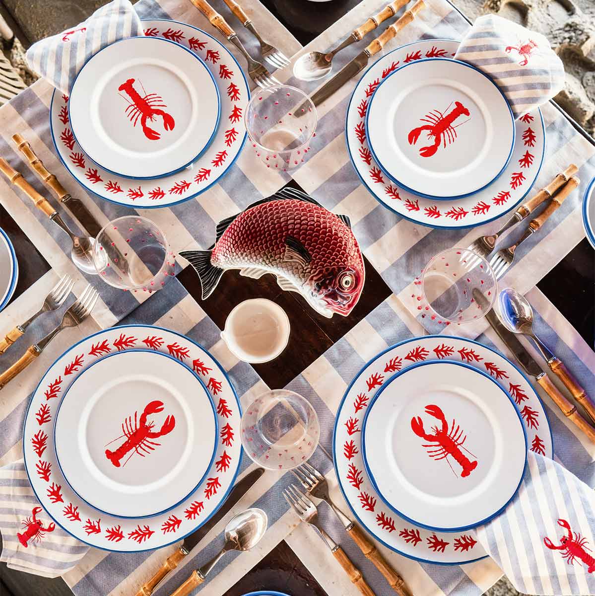 Set de Vajilla Platos Trinche Candy Cane Rayas Azules y Platos de Ensalada Puntitos y Pez. Set para 4 personas
