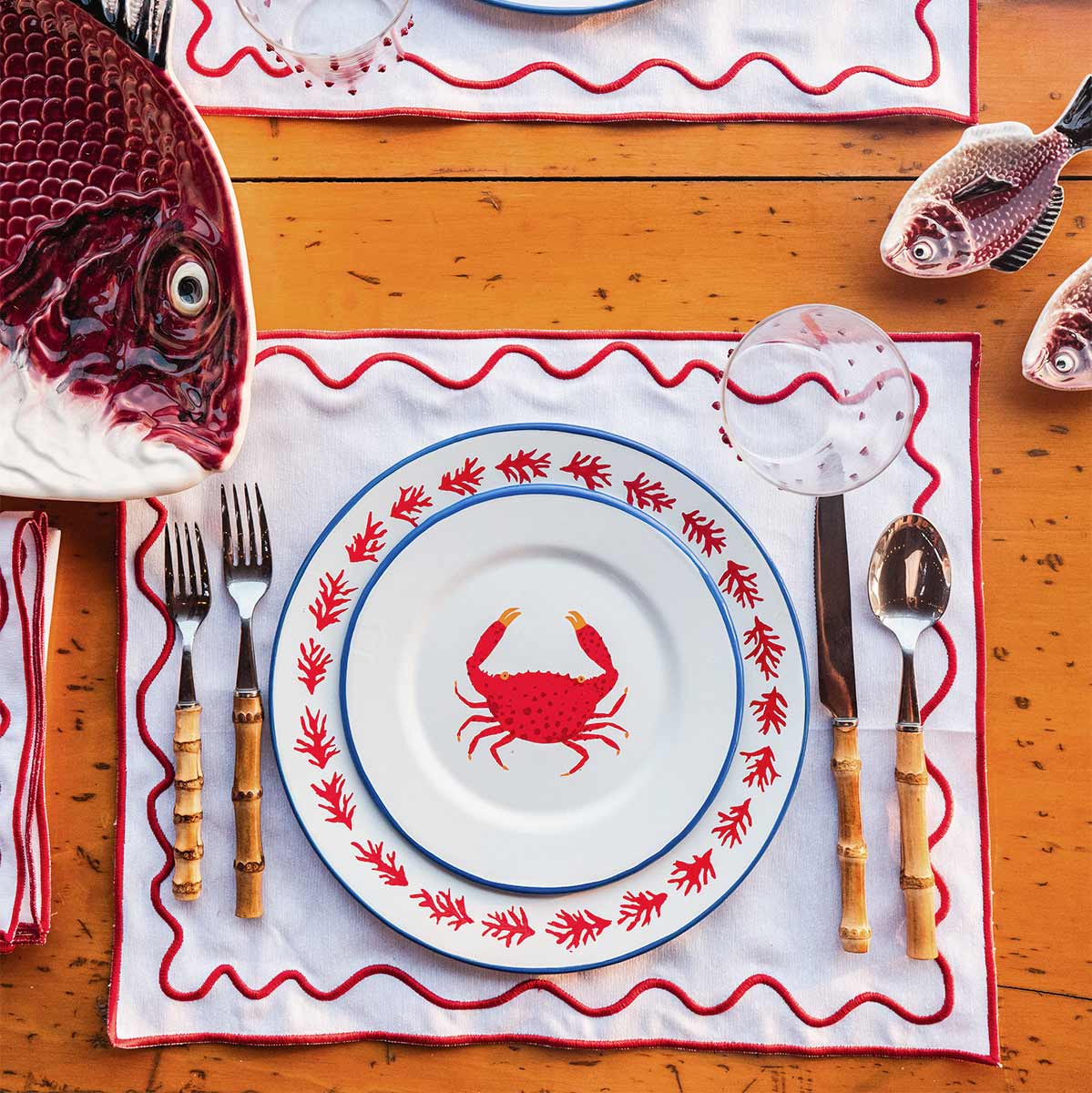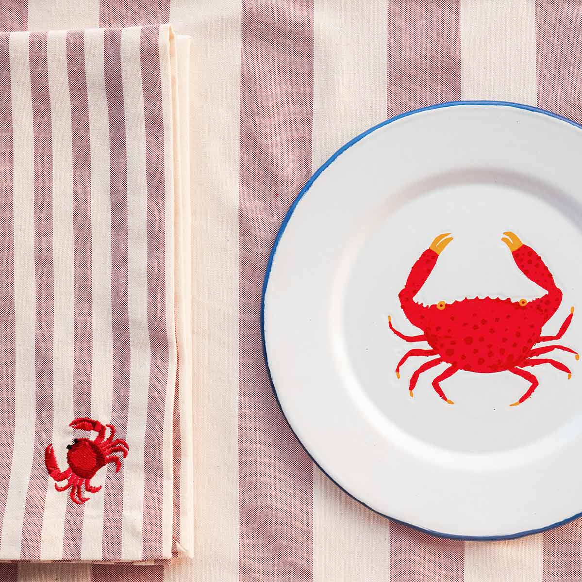 Set de 4 Individuales con Rayas Blancas y Rojas y 4 Servilletas de Loneta de Algodón con Rayas Blancas y Rojas con Bordado de Cangrejo