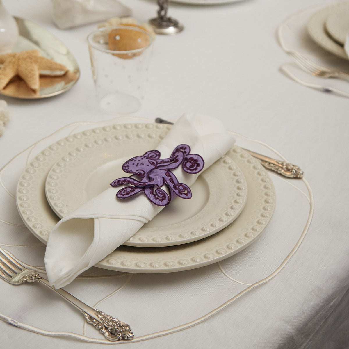 THE OCTOPUS ZASHPACK: Mantelería La Mar con Servilletas de Lino con Bordado de Coral Negro y Servilleteros con Bordado de Pulpo en Lino Morado. Set para 4 personas
