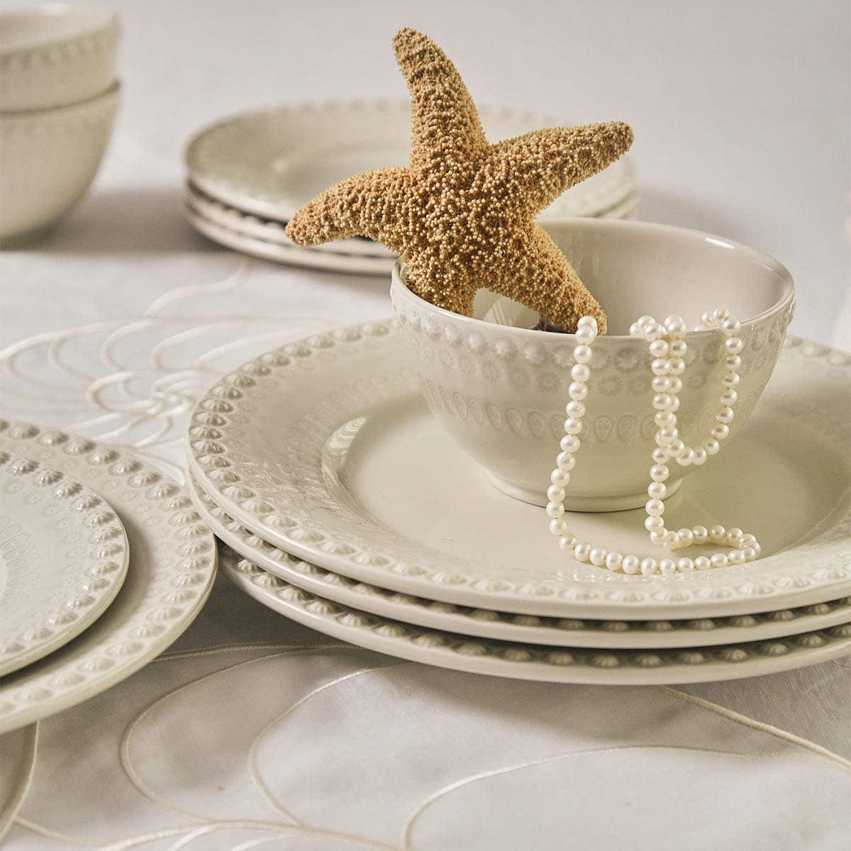 Mantelería La Mar con Individuales Concha en Yute Ivory y Servilletas de Lino con Bordado de Caracol de Mar. Set para 4 personas