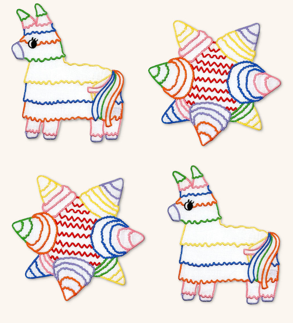 Cocteleras Posada en Lino Blanco con Bordado de Piñata y Burrito de Colores. Set de 4