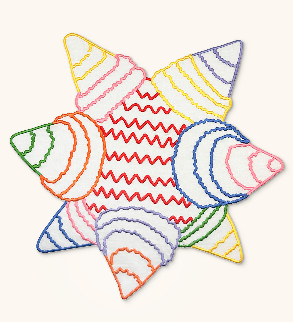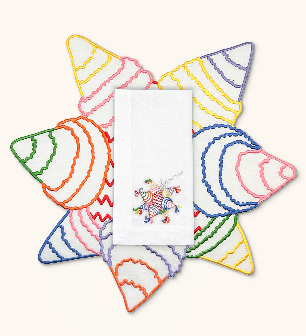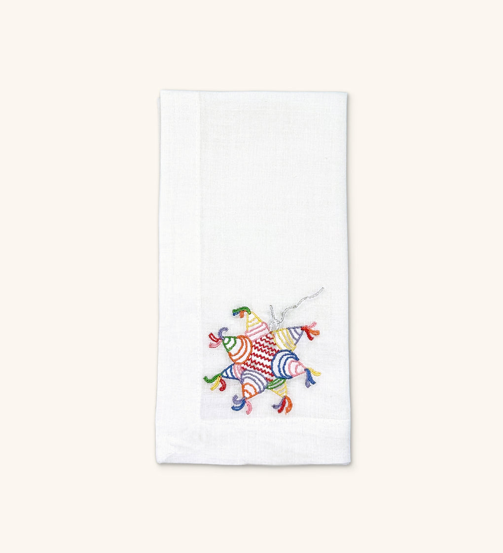 Servilletas Posada en Lino Blanco con Bordado de Piñata de Colores. Set de 4
