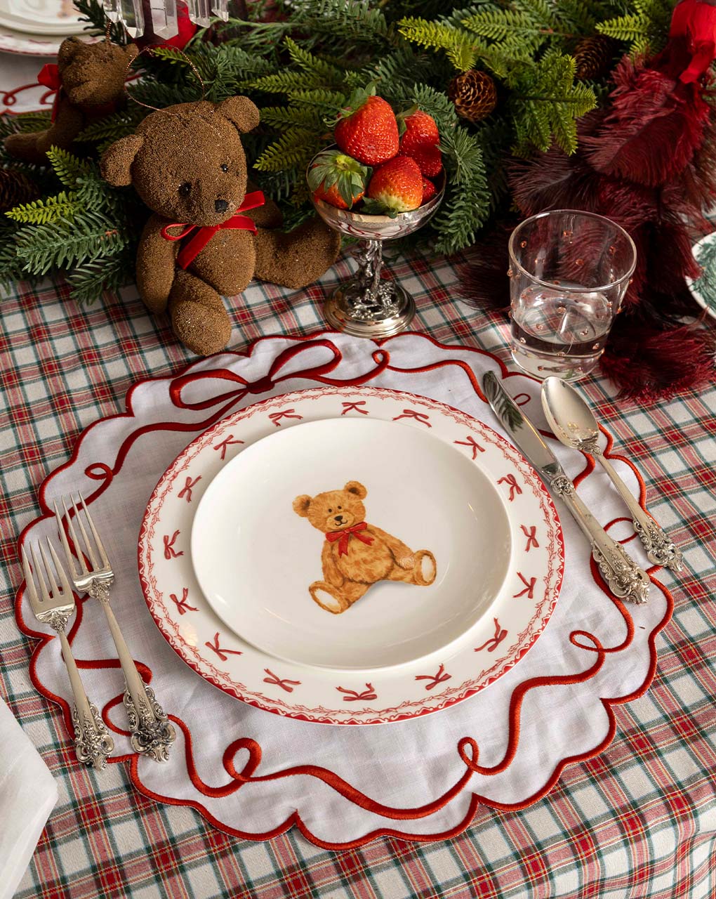Platos trinche con guirnalda de moños rojos hechos en porcelana, diseñados en exclusiva para Zash por María de Vecchi. El toque ideal para la mesa de Navidad.
