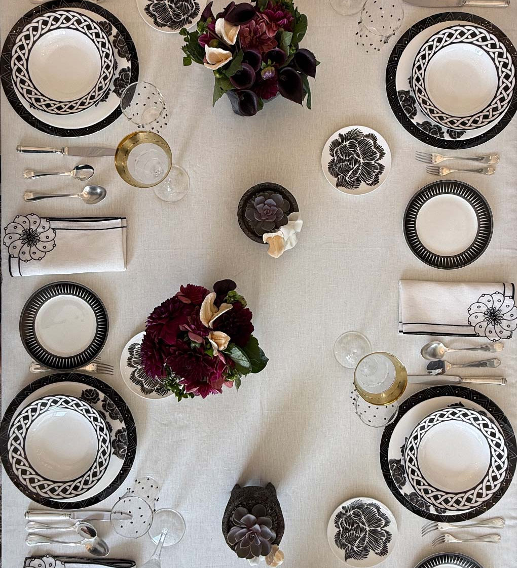 Mantel de Mesa Rectangular en Lino Blanco con Flores Negras 5 x 2.7m