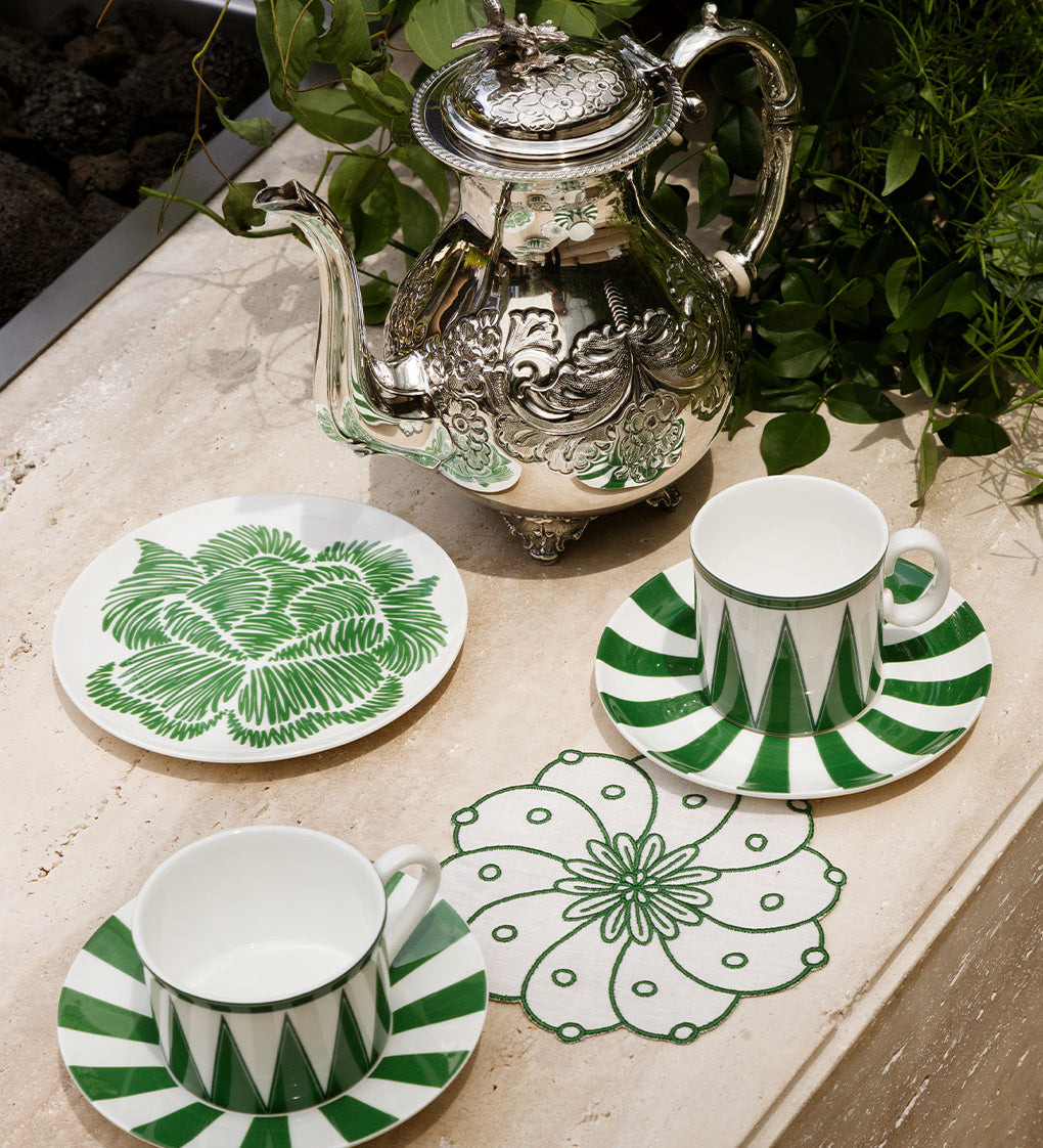 Coasters Identidad en Lino Blanco con Bordado de Biznaga, Pasiflora y Dalia Verdes. Set de 4