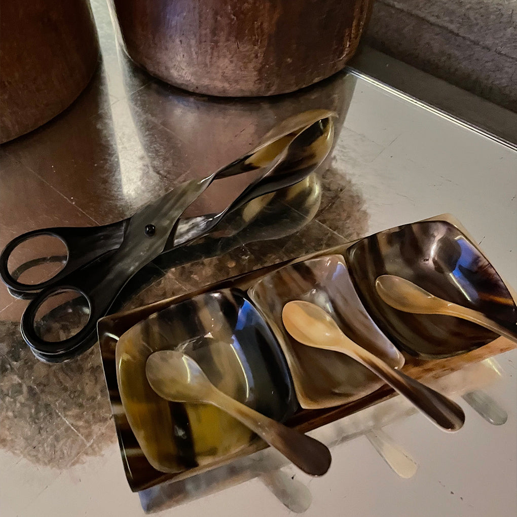 Bandeja con 3 Salseros y 3 Cucharas de Cuerno de Resina