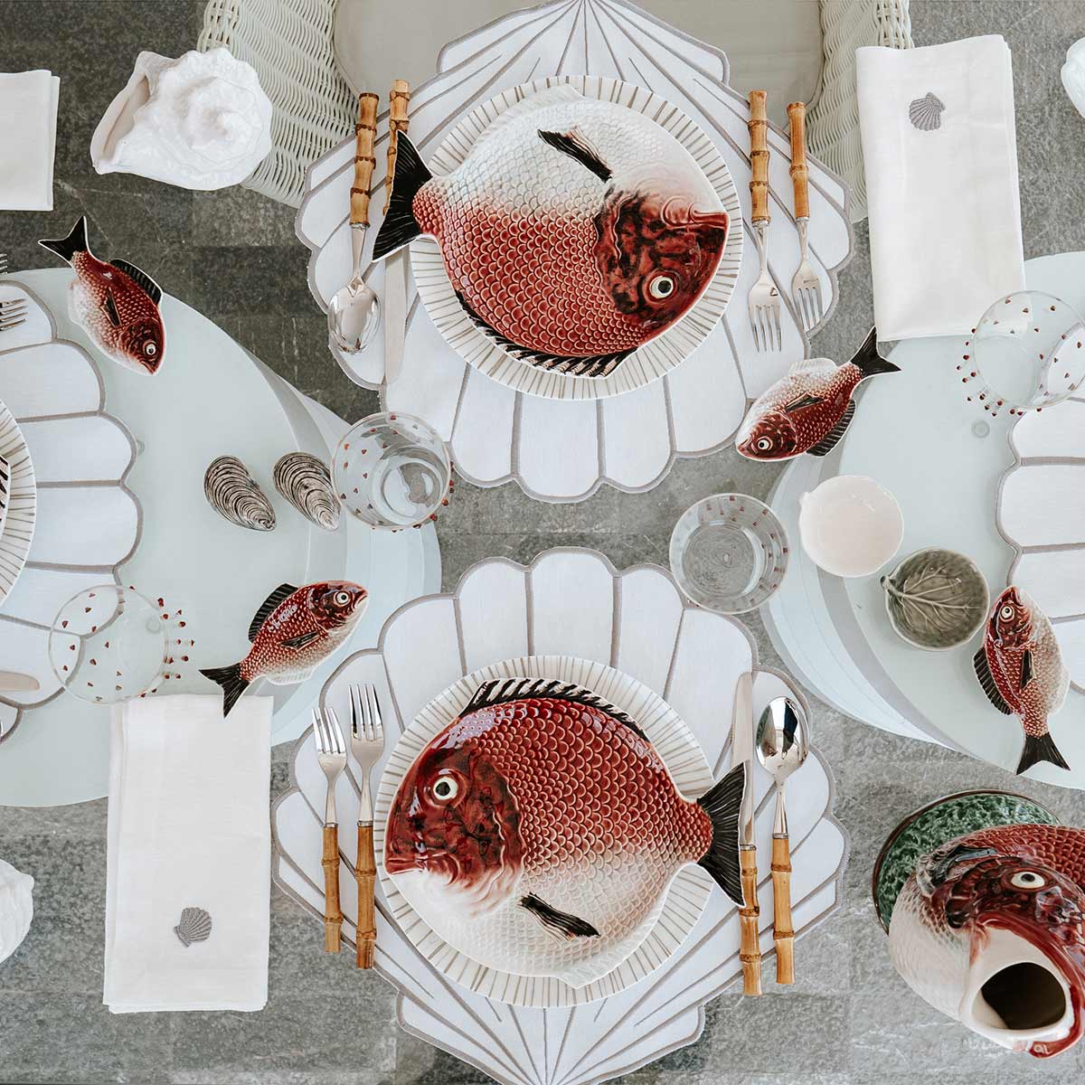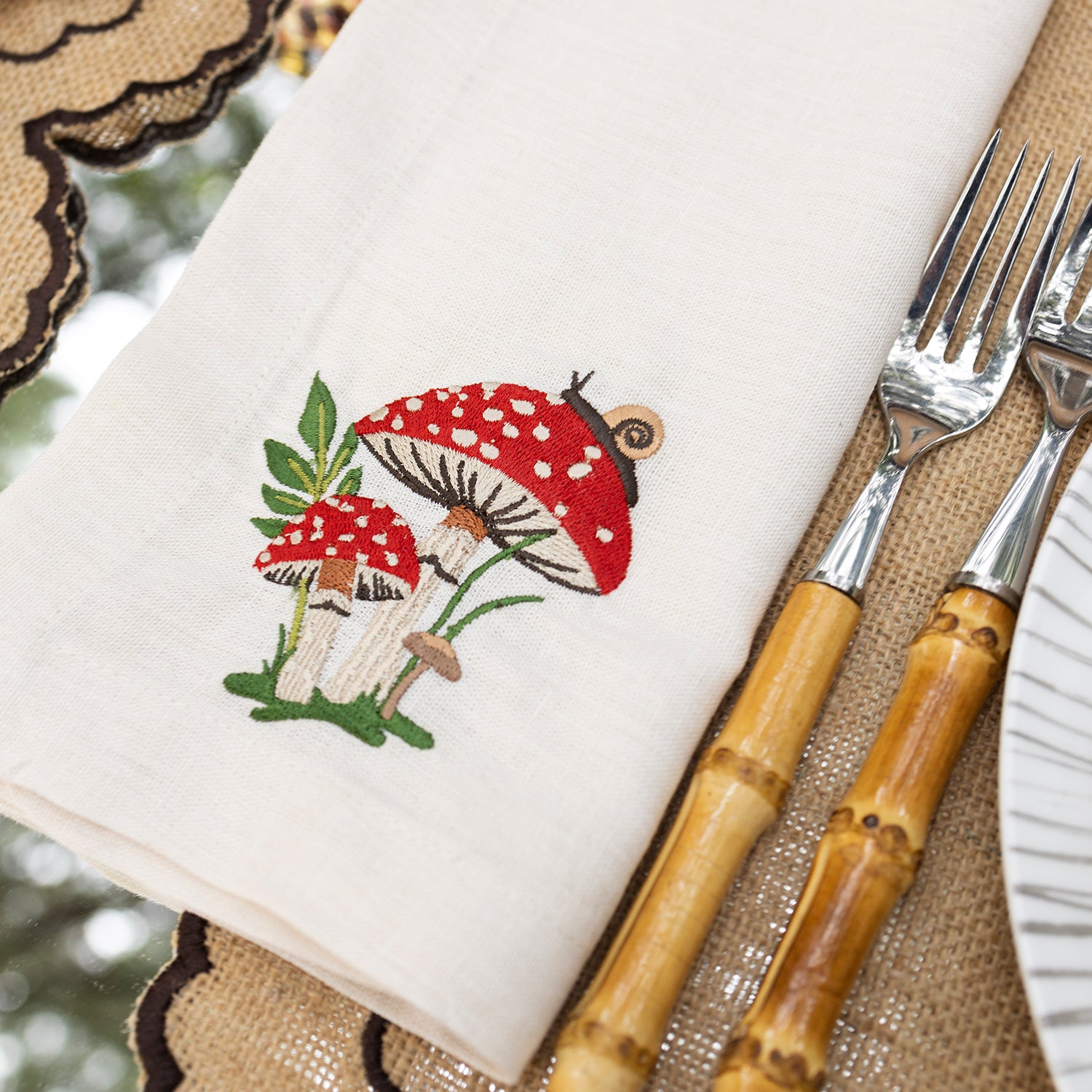 Servilleta en Lino Color Crudo con Motivo de Hongo y Caracol. Set de 4