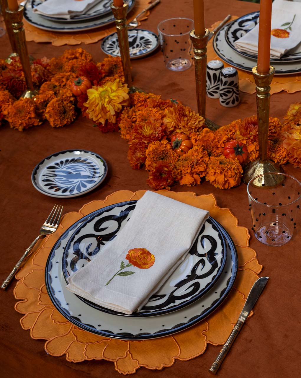 Individuales en forma de flor de cempasúchil. Cuidadosamente bordado y recortado a mano. Ideal para la mesa del Día de Muertos o para settings de otoño.