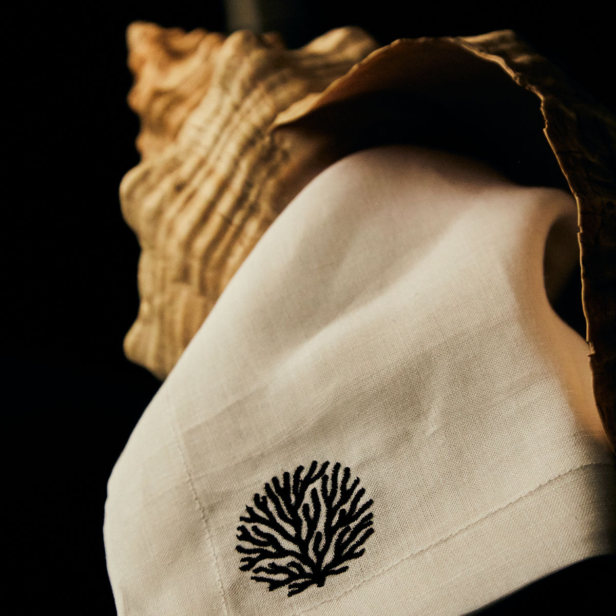 Servilletas La Mar en Lino Blanco con Bordado de Coral Negro. Set de 4