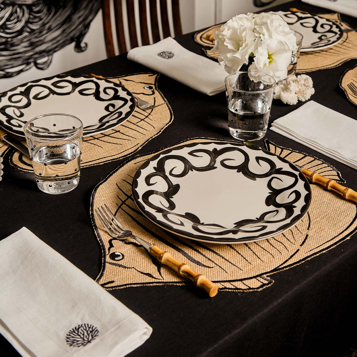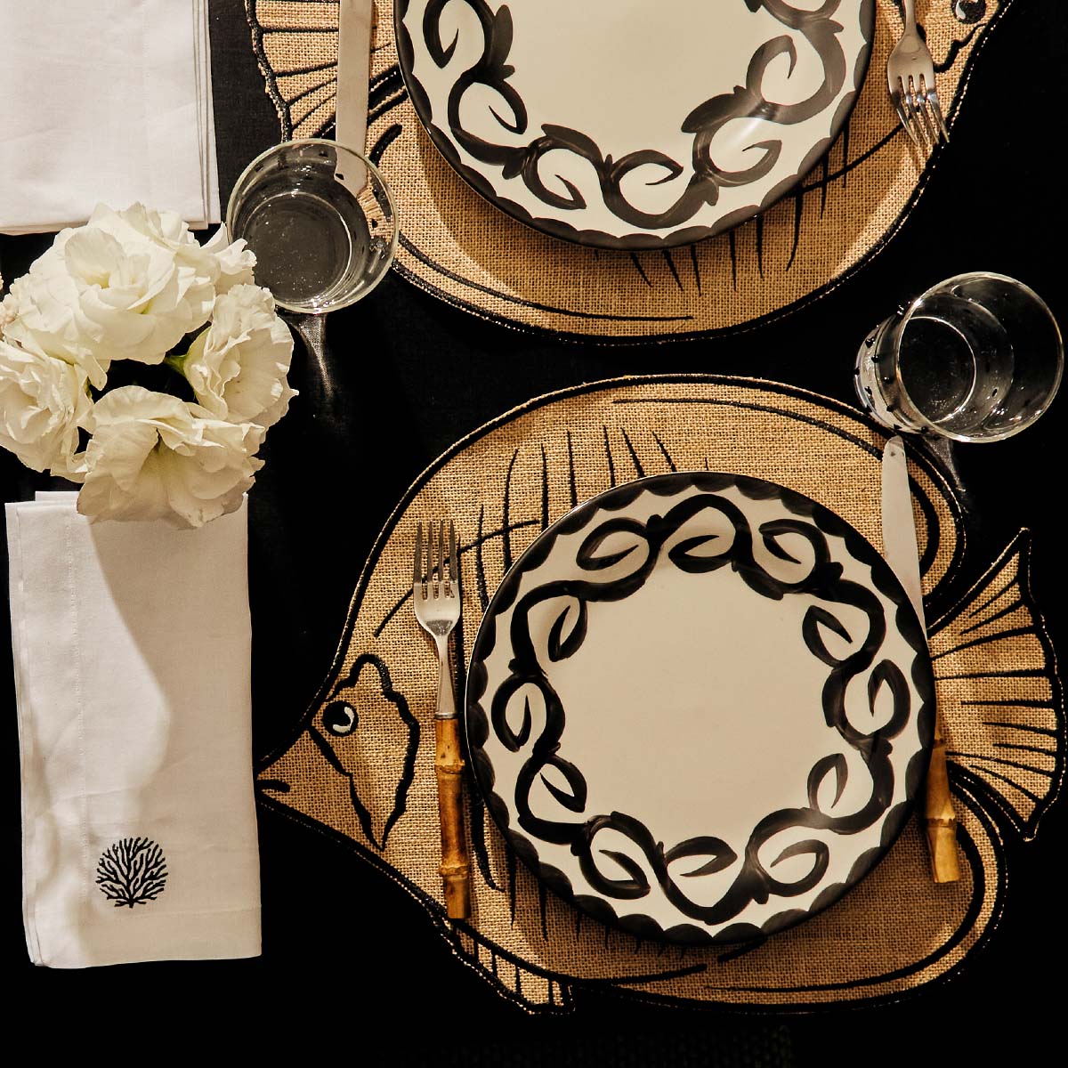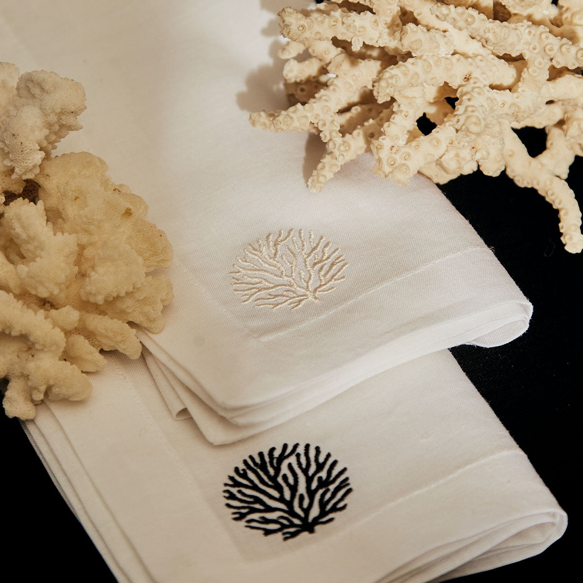 Servilletas de lino con bordado de coral negro. Clásicas, chic y perfectas para cualquier mesa.