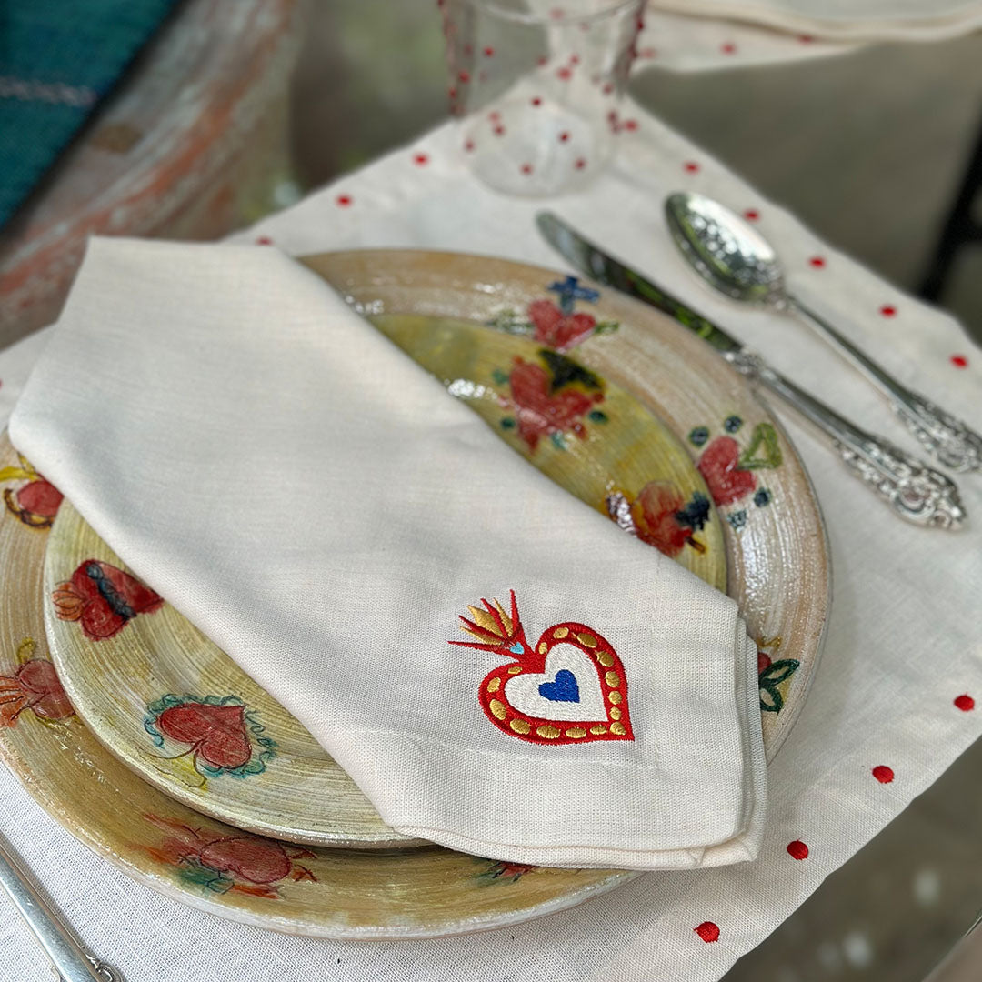 Llena tu mesa de tradición y belleza con los milagritos mexicanos. Servilletas de lino con corazones coloridos bordados que representan la fortuna, el amor y los buenos deseos.