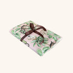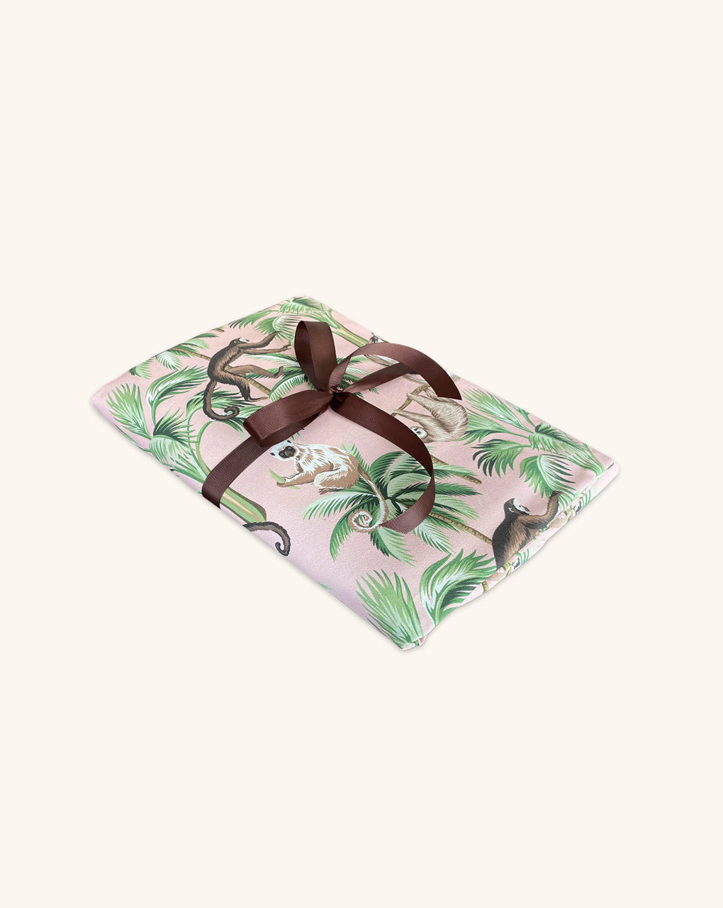 Mantel de mesa rectangular con estampado tropical de palmeras y changos y fondo rosa. Ideal para una mesa cool y divertida de verano.