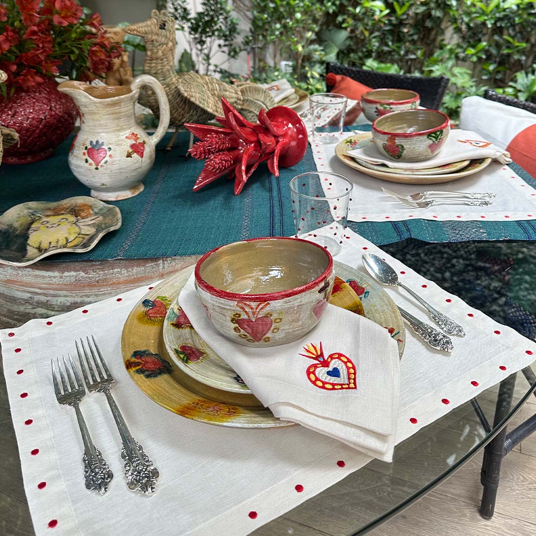 Mantelería Milagritos con Individuales Silvia con Puntitos Rojos y Servilletas Milagritos con Bordado de Corazón en llamas en Lino Arena. Set para 4 personas.