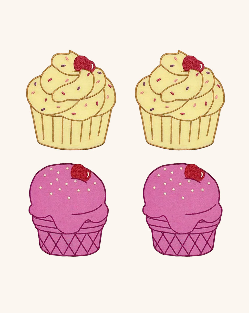 Cocteleras en Lino Violeta y Mantequilla con Bordado de Cupcake y Helado. Set de 4
