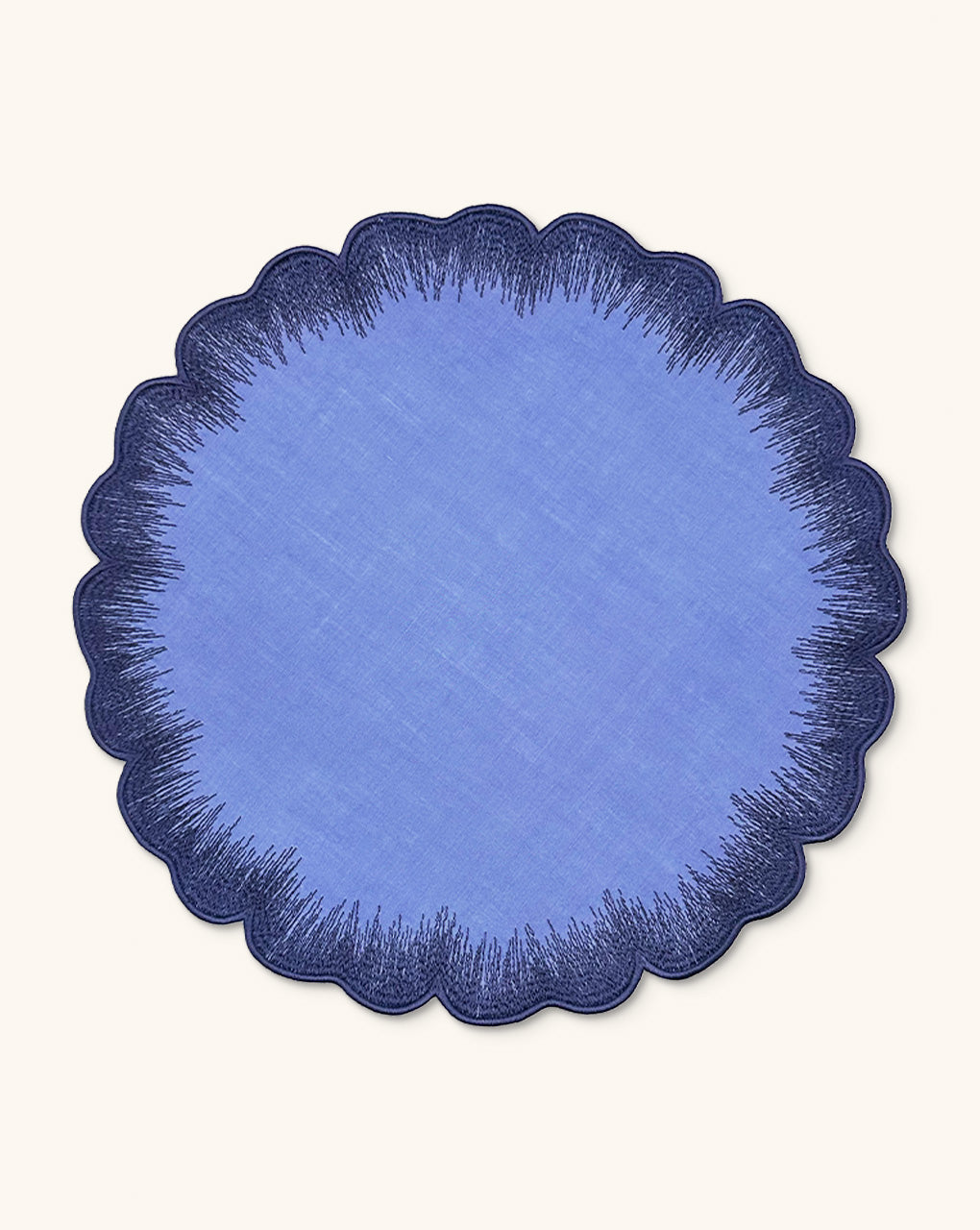Un individual sofisticado, atemporal y con un craftsmanship excepcional. Cada uno es bordado en lino azul con hilo azul imperial, recortado a mano cuidadosamente. Lo más chic para poner en tu mesa.
