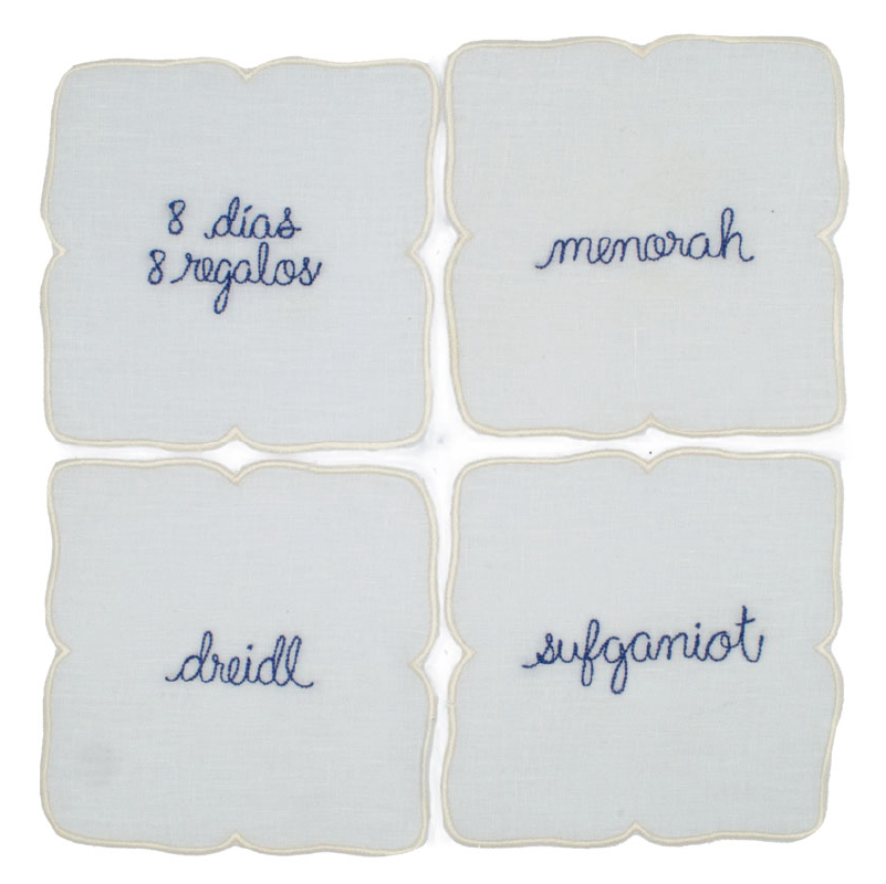 Juego de 4 Servilletas de coctel Bordadas con Palabras y Frases de Hanukka. Set 2