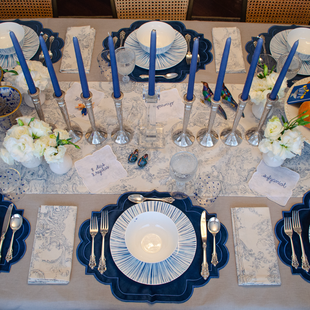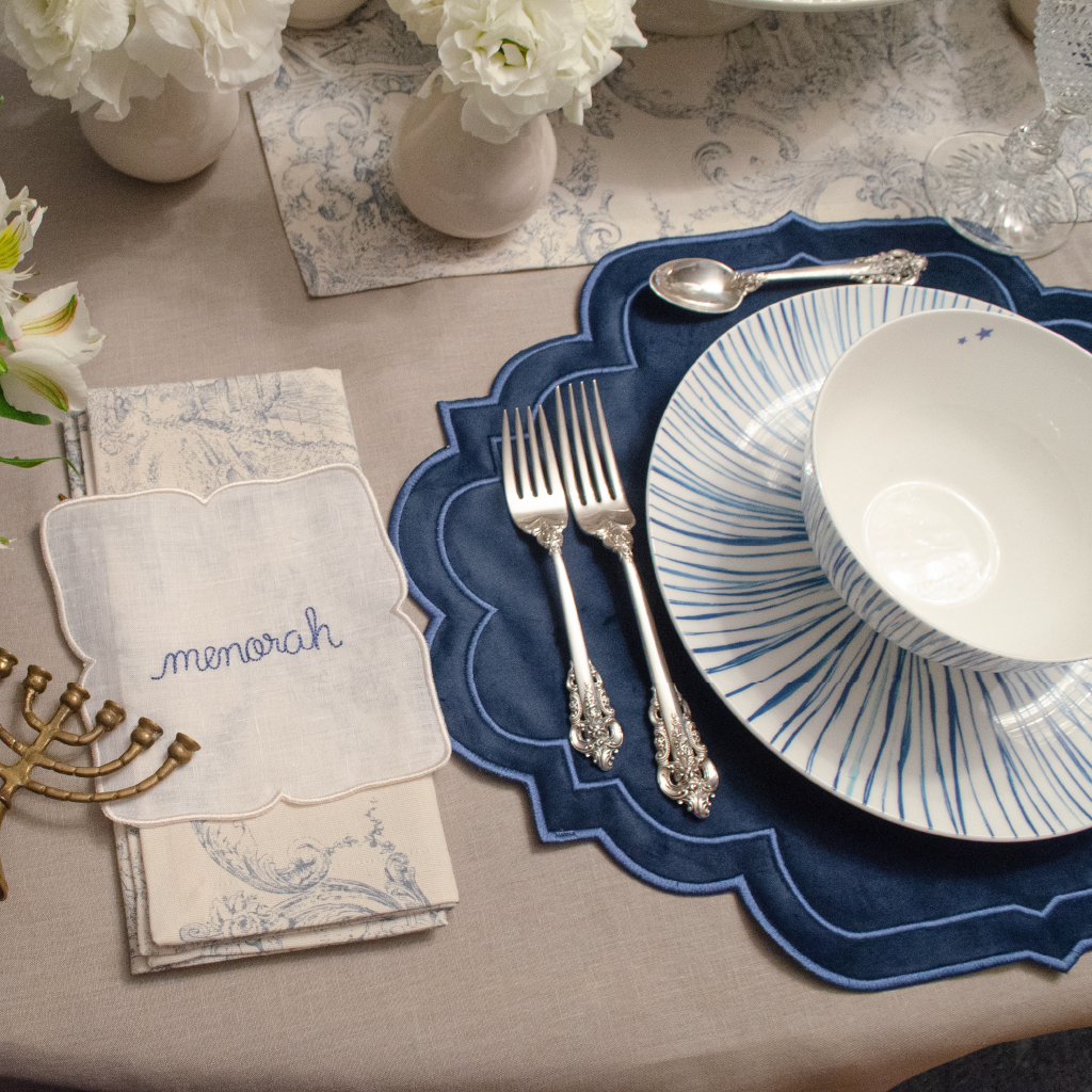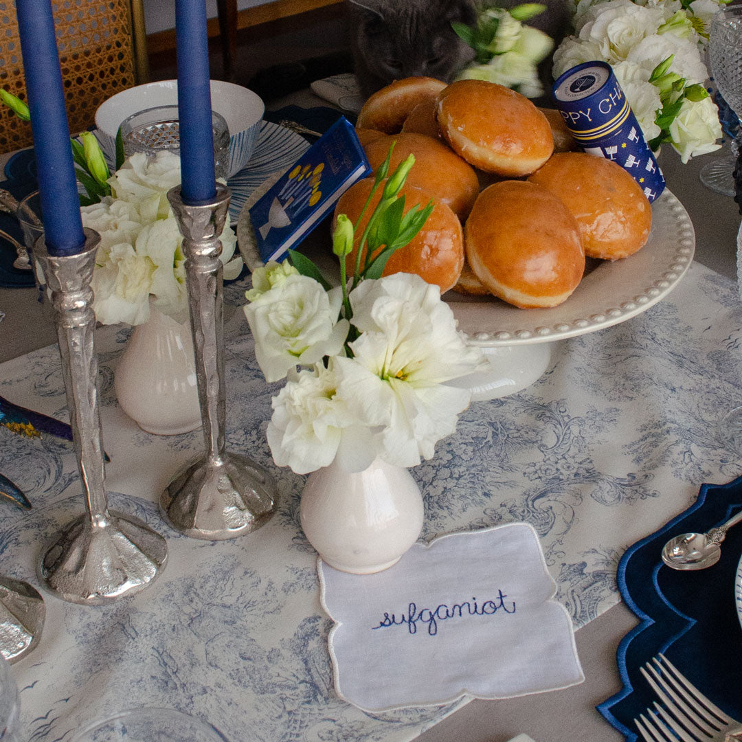 Cocteleras de Hanukka: Set de 4 servilletas de coctel con frases bordadas en lino blanco con bordado azul.