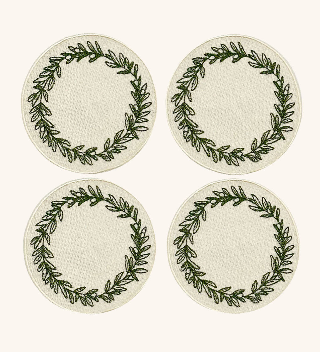Coasters Olivos con Bordado de Guirnalda Verde en Lino Arena. Set de 4