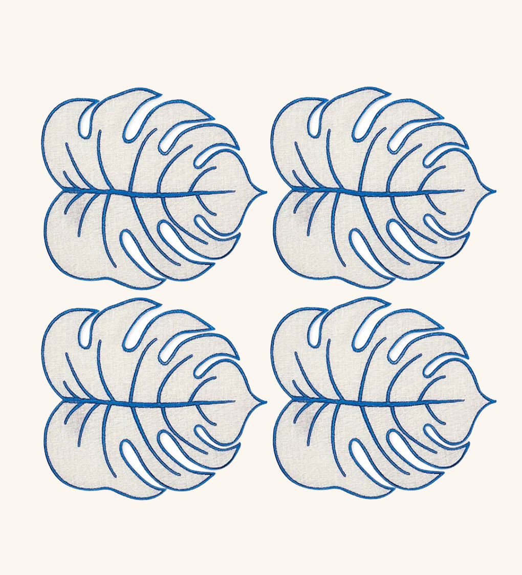 Cocteleras Tropic en Lino Arena Bordadas en forma de Hoja Orilla Azul. Set de 4.