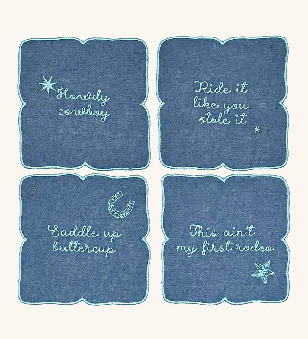 Cocteleras con Frases Vaqueras en Lino Azul con Bordado Turquesa. Set de 4