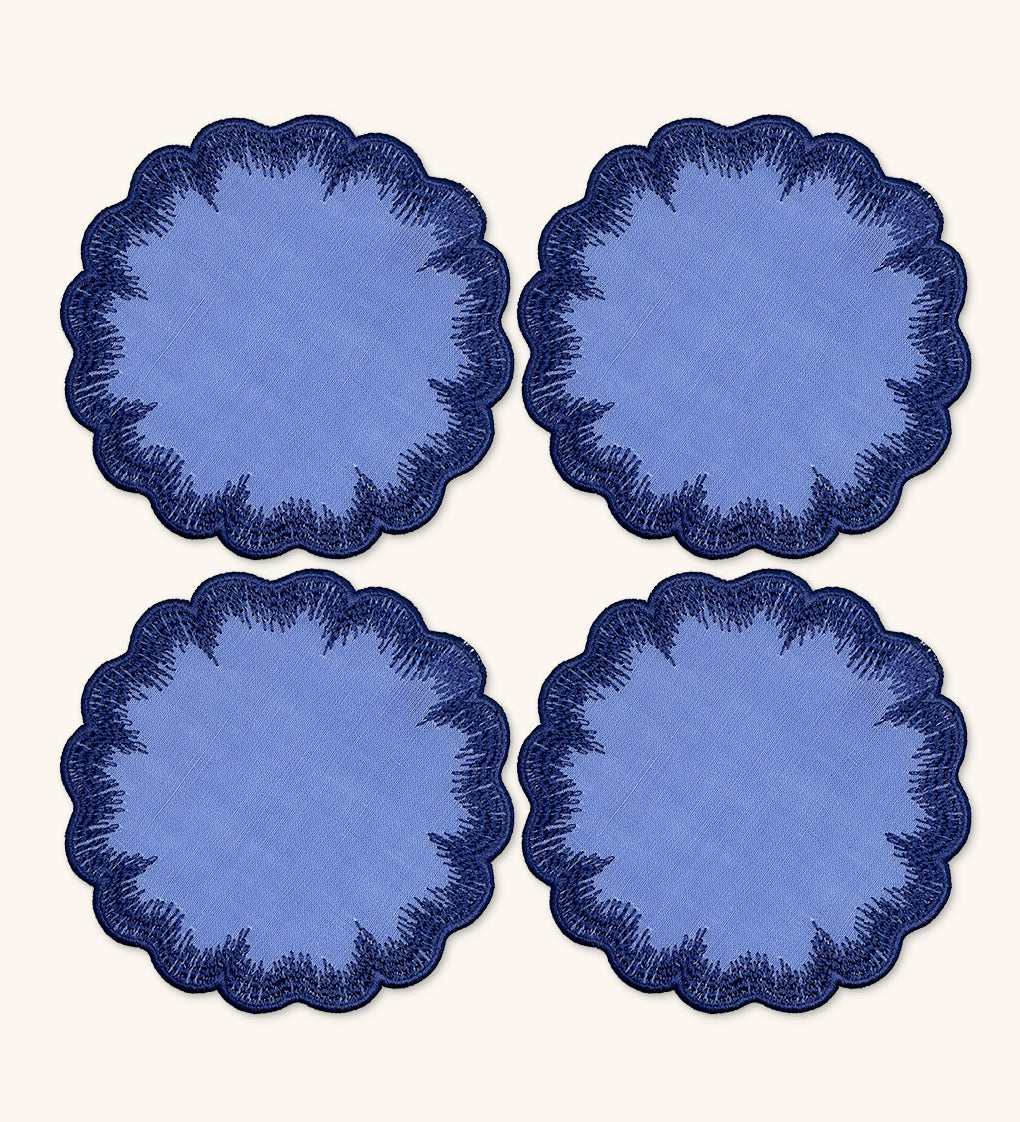 Coasters Vivi en Lino Azul con Bordado de Pelitos. Set de 4
