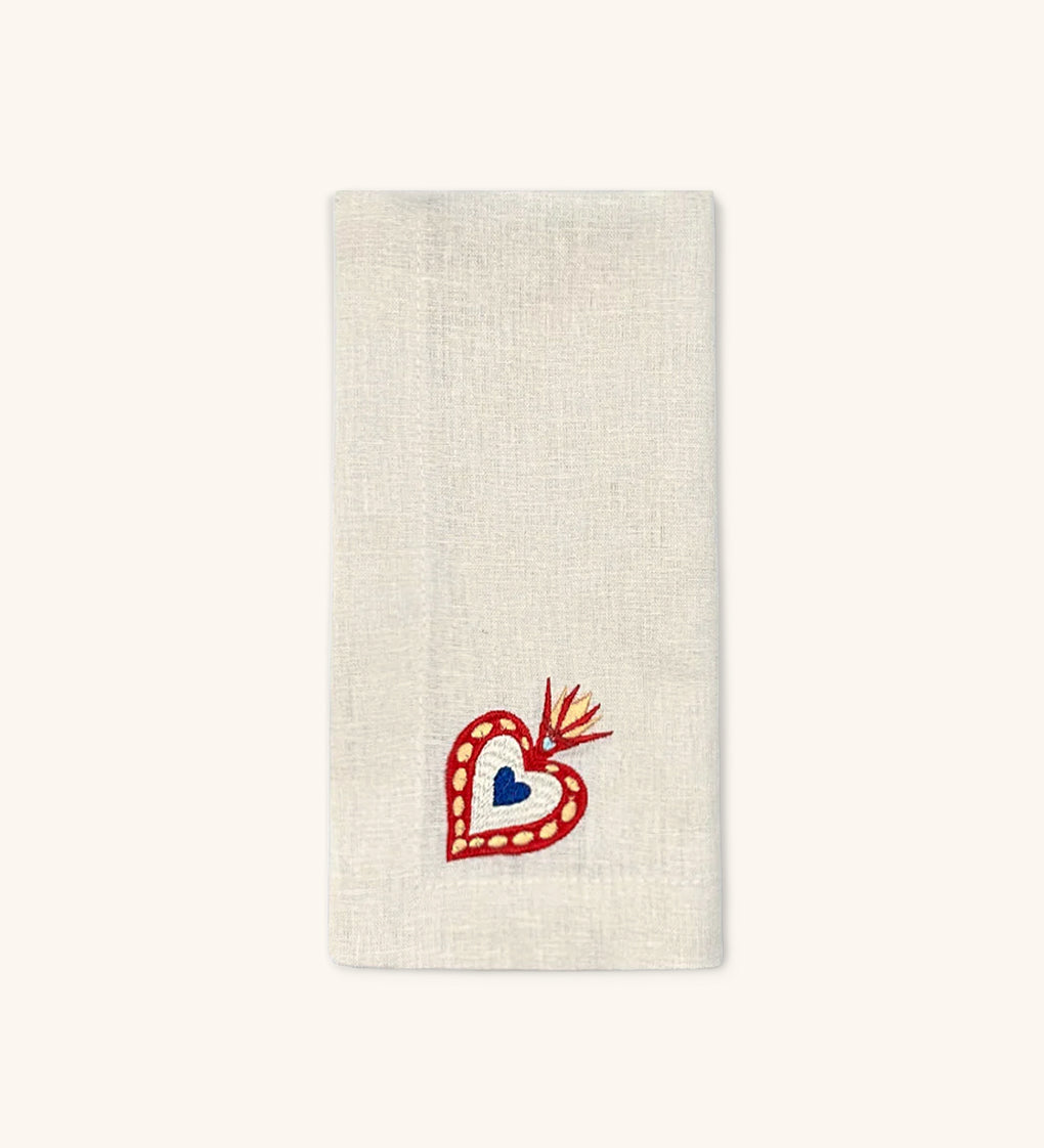 Servilletas Milagritos con Bordado de Corazón en llamas en Lino Arena. Set de 4.