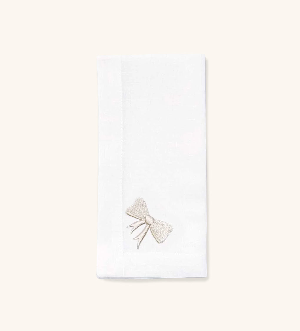 Servilleta en Lino Blanco con Bordado de Moñito Ivory. Set de 4