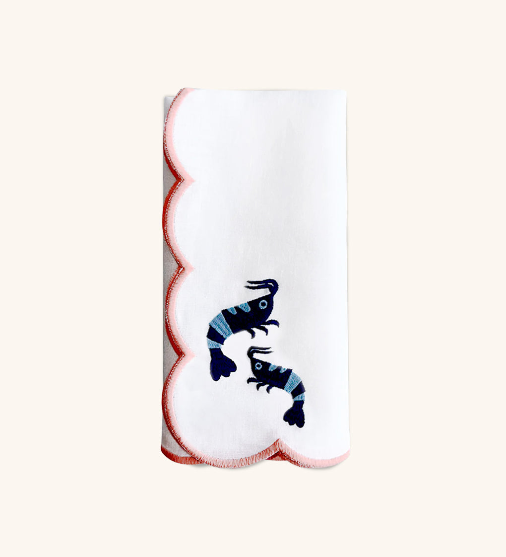 Servilletas Arrecife en Lino Blanco con Bordado de Camarones en tonos de azul y orilla rosa. Set de 4