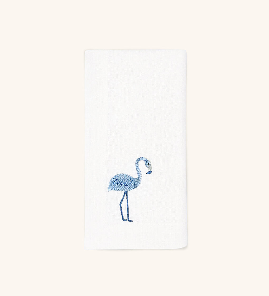 Servilletas Tropic en Lino Arena con Bordado de Flamingo Azul. Set de 4.