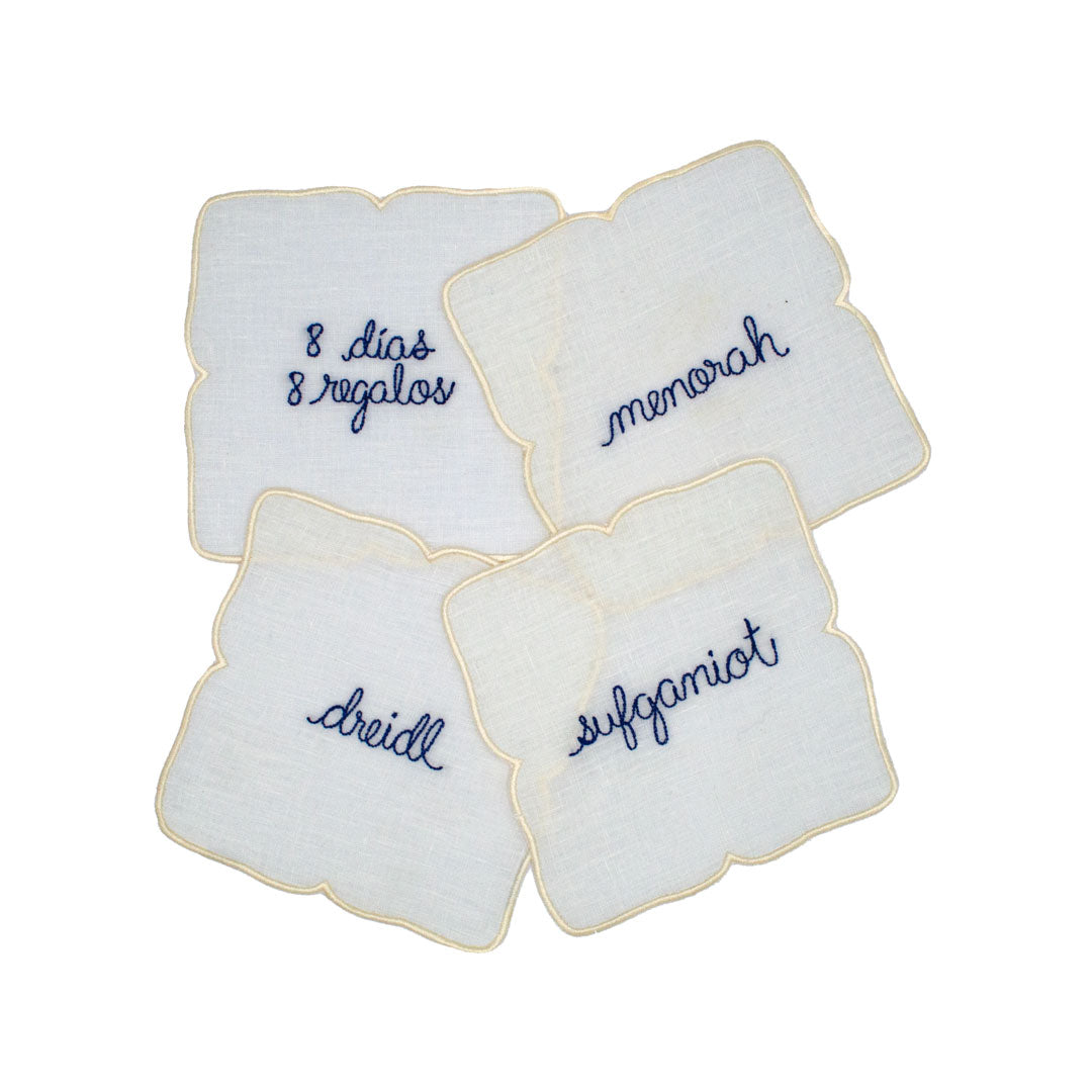 Juego de 4 Servilletas de coctel Bordadas con Palabras y Frases de Hanukka. Set 2