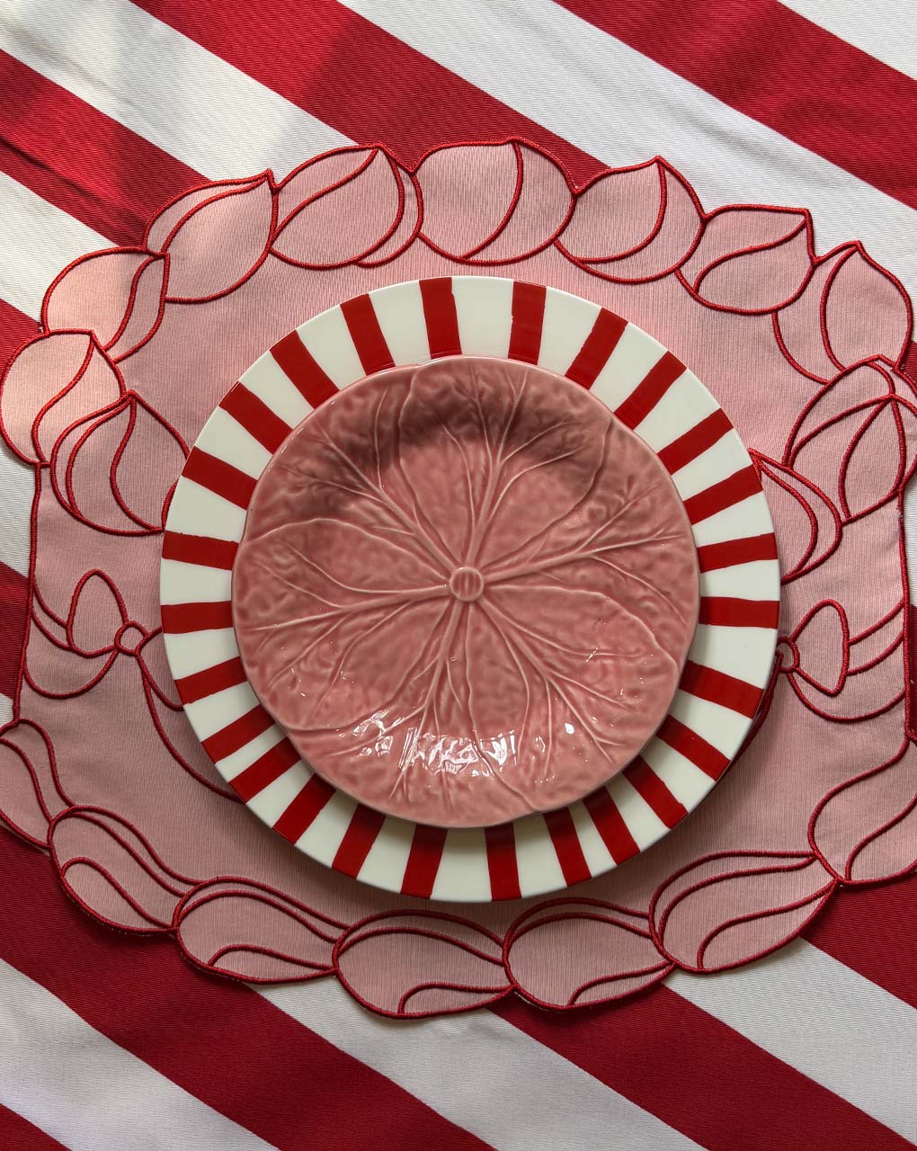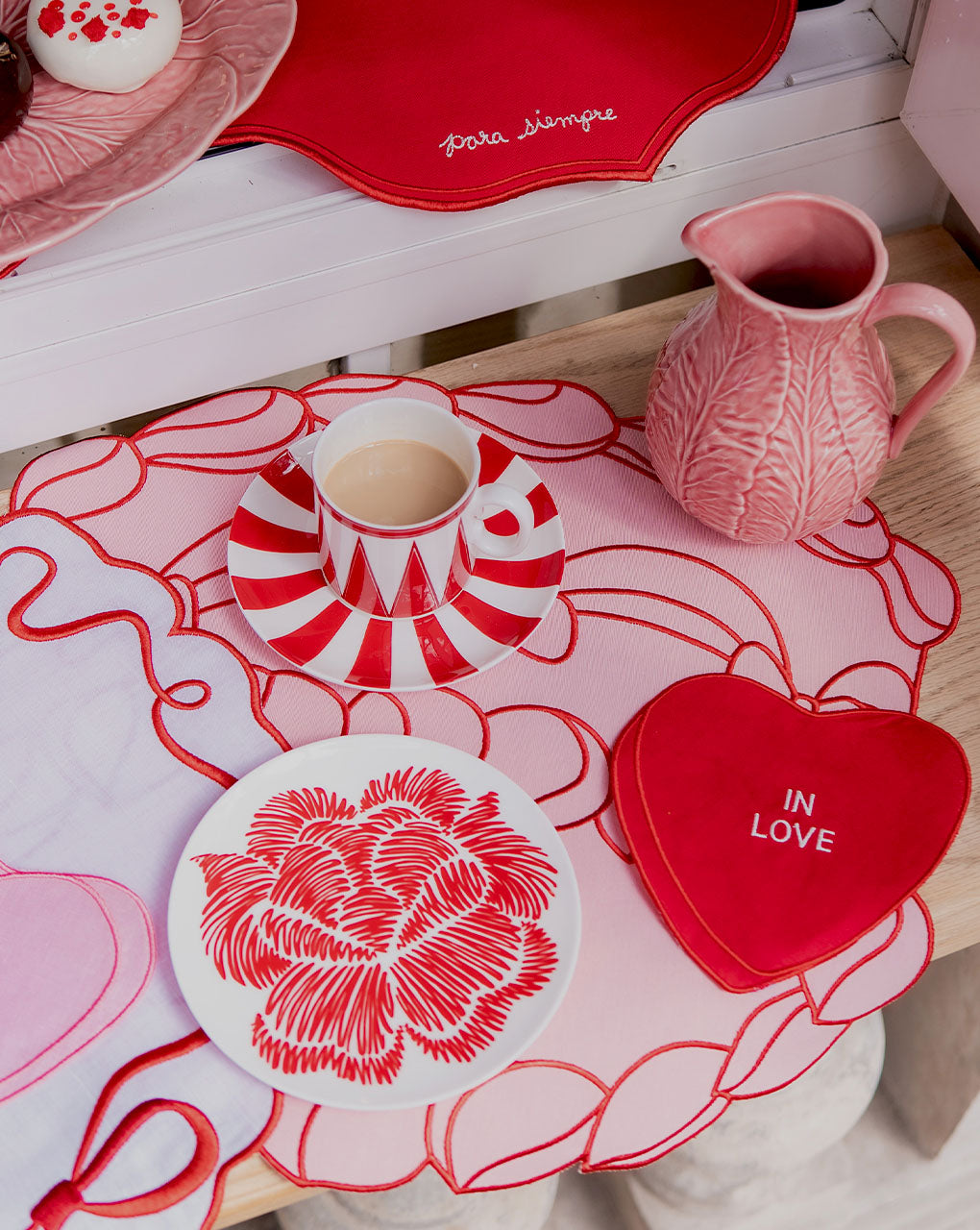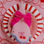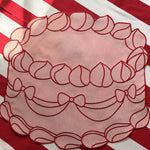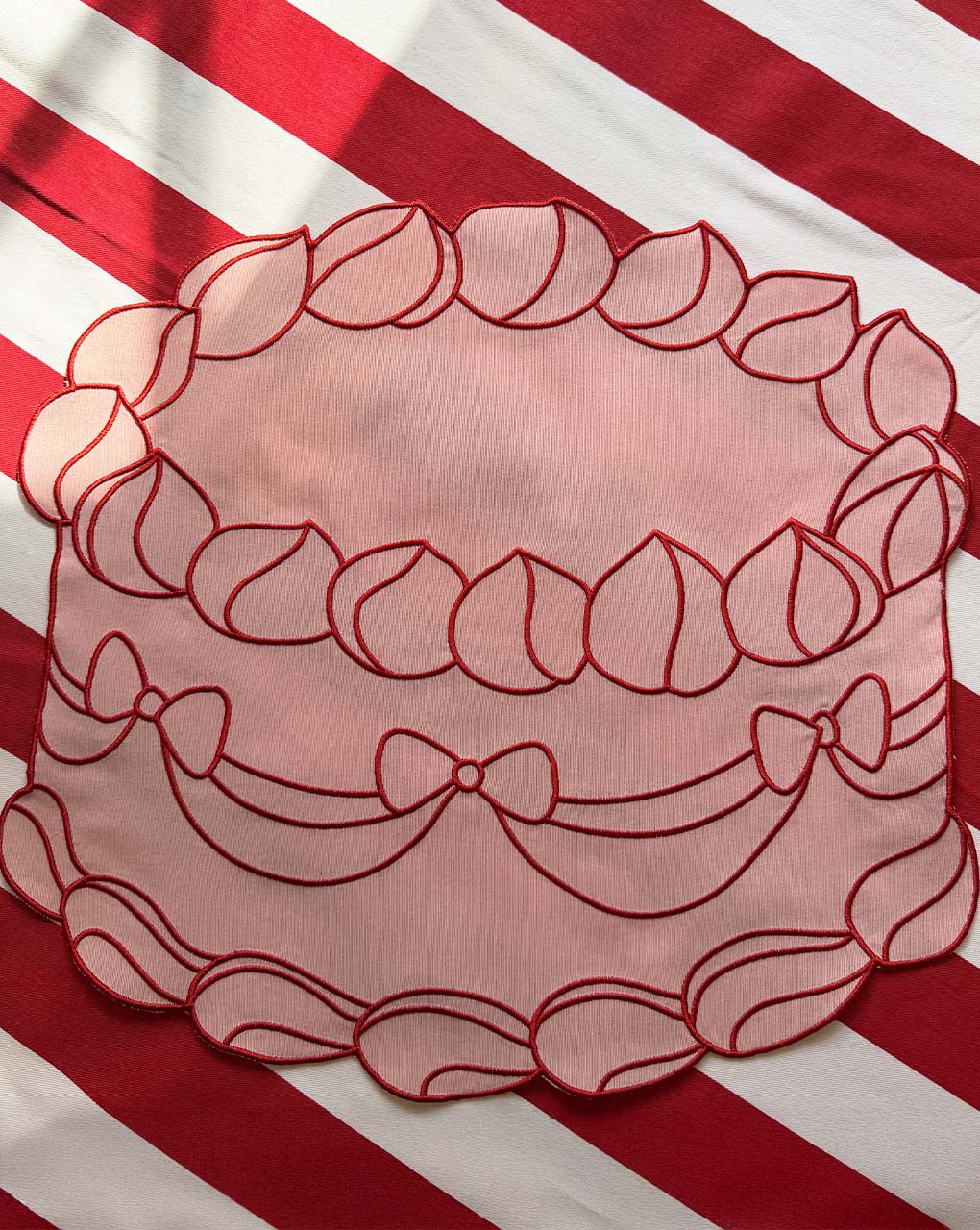 Los más hermosos y dulces manteles individuales que has visto, elaborados en loneta de algodón color rosa con un apetitoso bordado de pastel en color rojo.