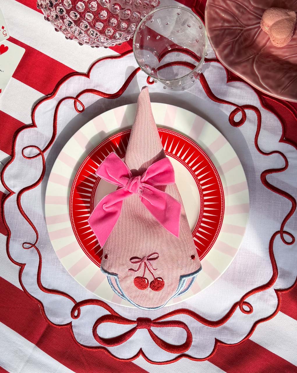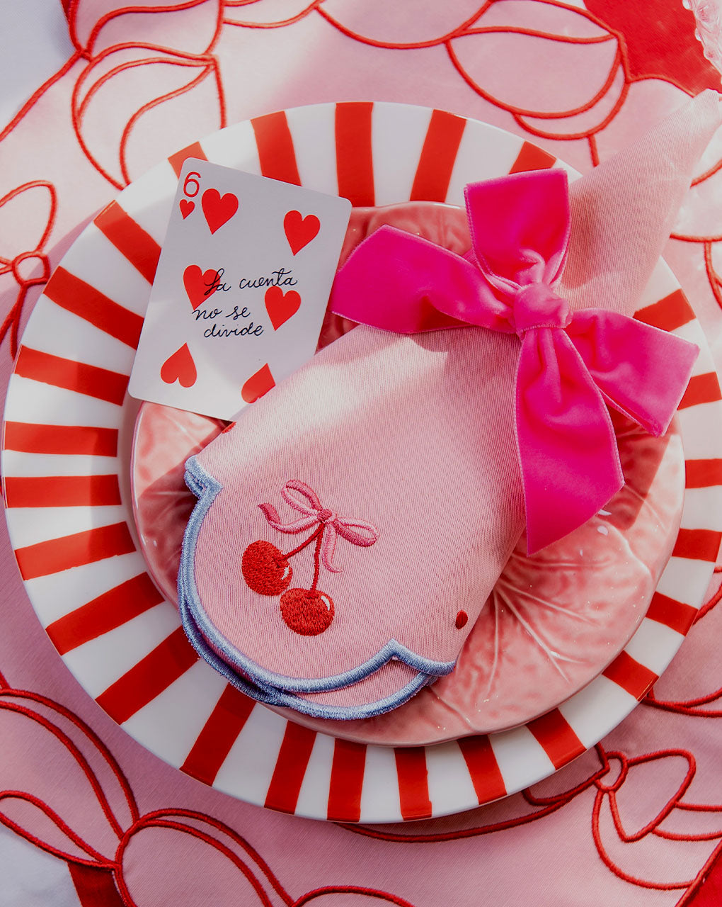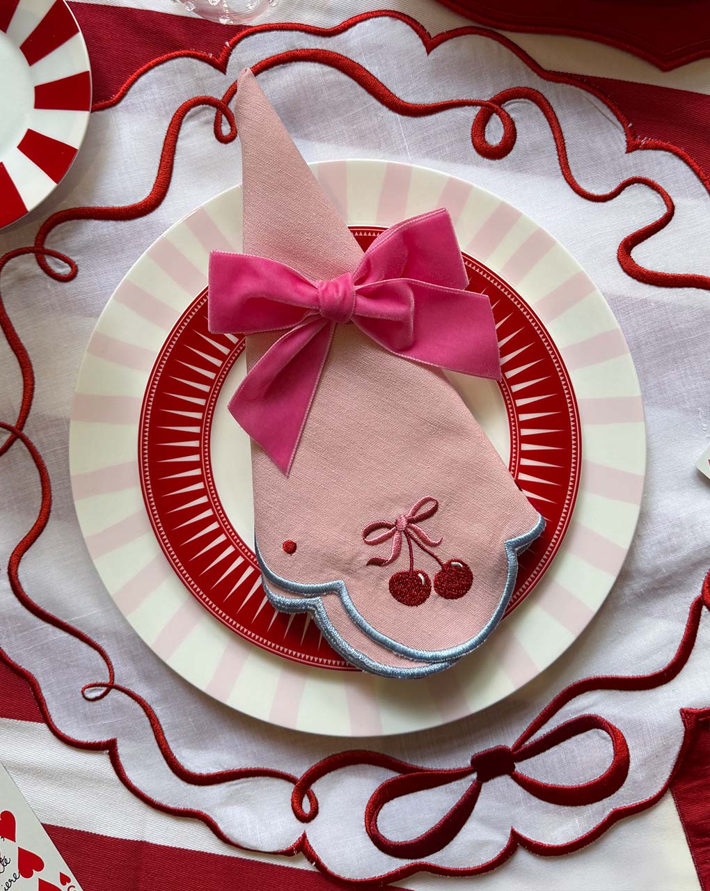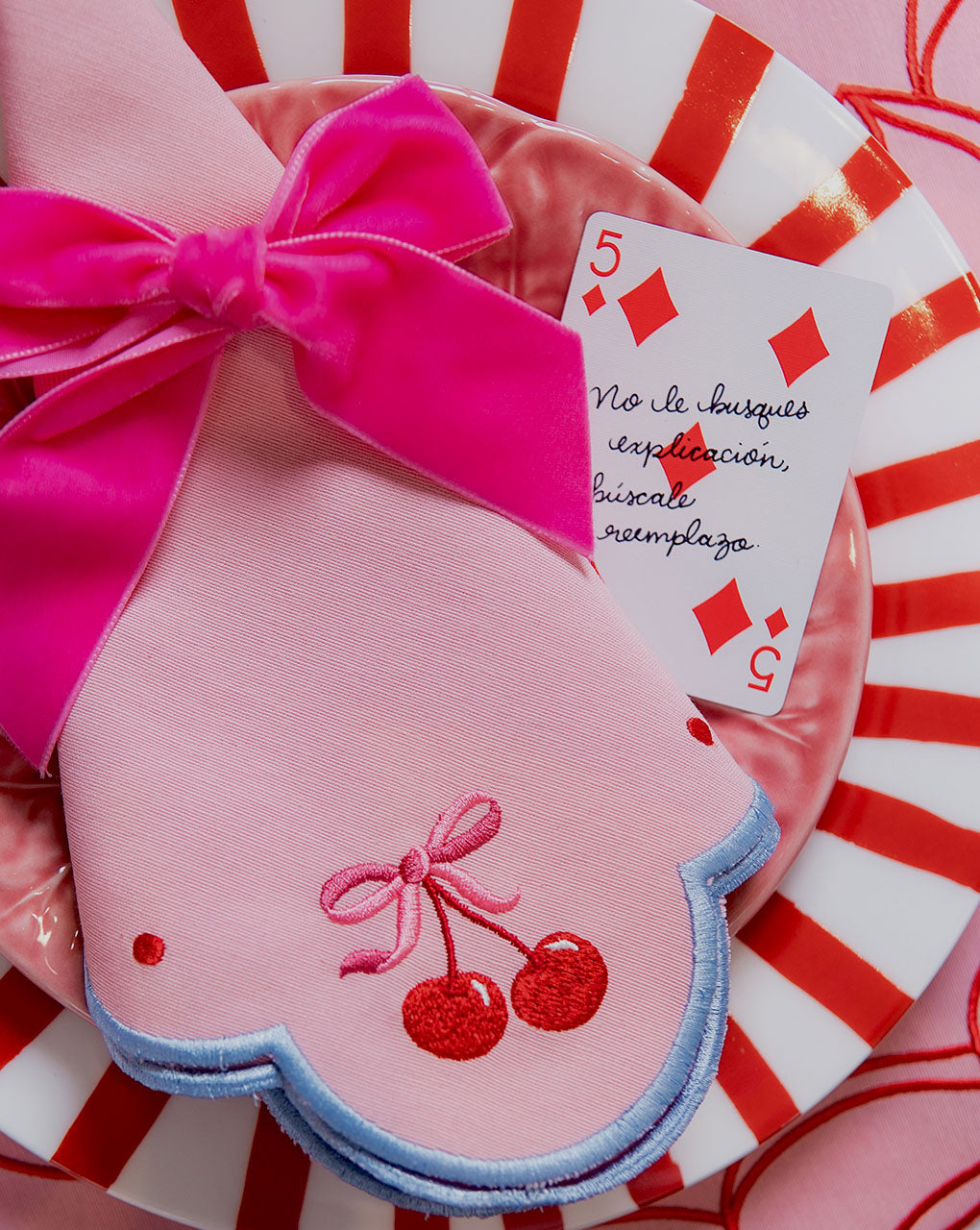 Servilletas Cherry en Algodón Rosa con Bordado de Moño y Cerecitas. Set de 4.