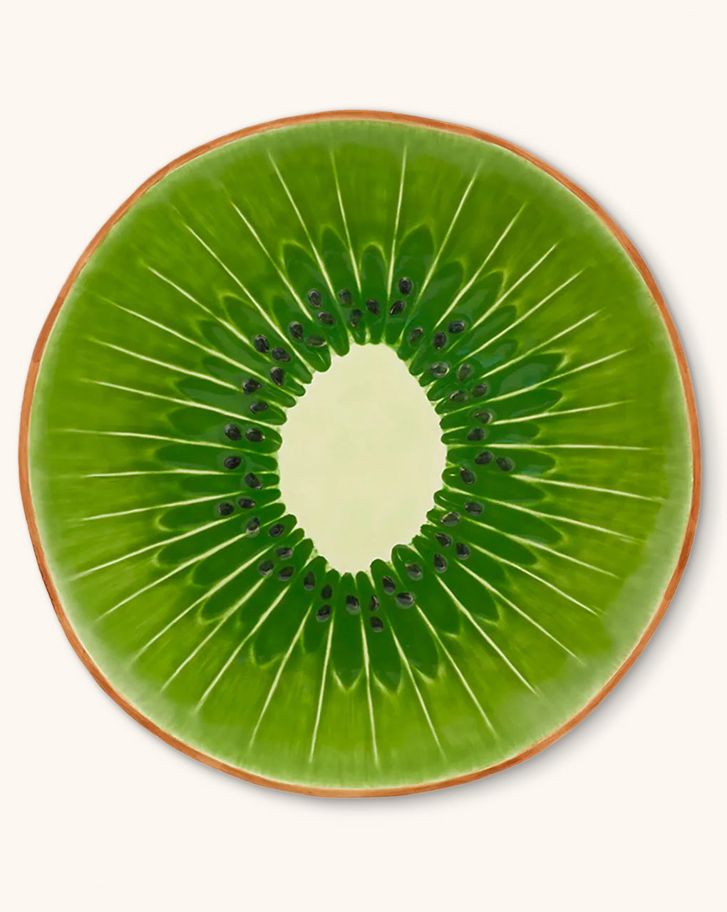 Hermoso juego de 4 bajo platos con diseño de kiwi de Bordallo Pinheiro, para lucirse en tu mesa con tus visitas, perfectos para cualquier momento.